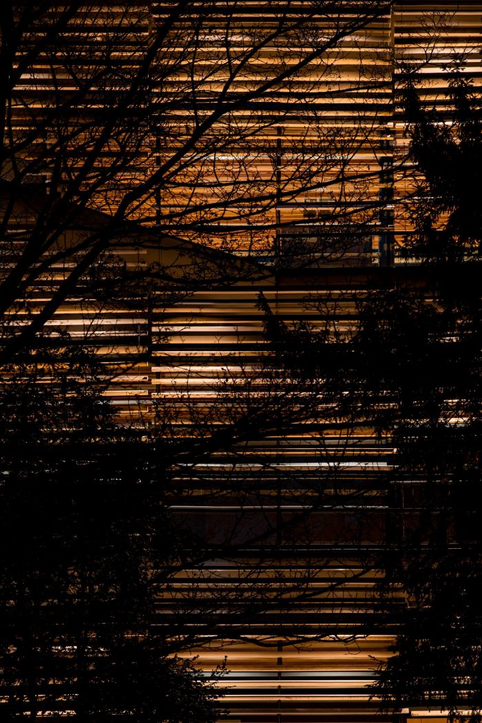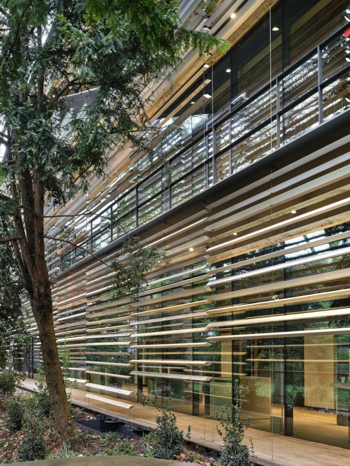 The envelope on the city side is mainly made from aluminium, and the envelope on the garden side is mainly made from wood, and at times these two materials are mixed in a gradational manner. This gives the building a biological skin that gently adapts to different environments while interacting with them.