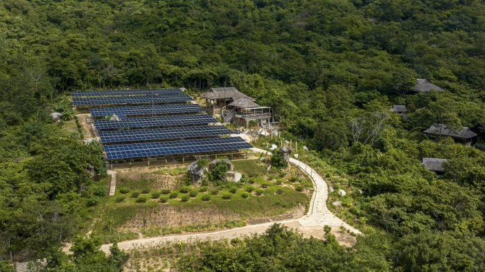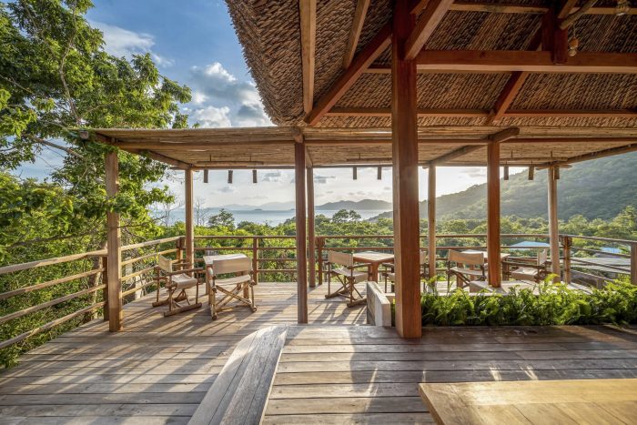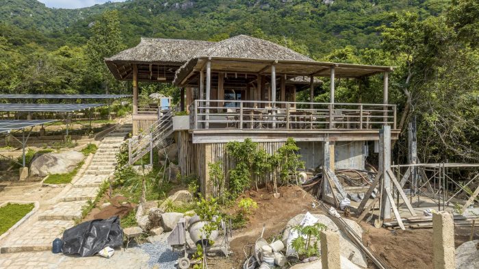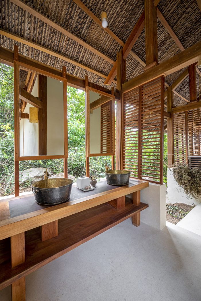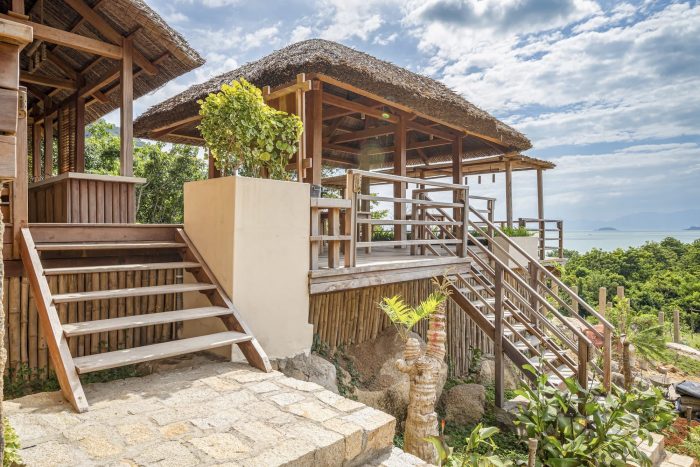 Therefore, the construction team took a lot of time to carry out the work even though the scale was not large. The building uses most of the local materials, from wood for the entire main structure and flooring, coarse-grained sand for the construction of granite floors, coconut leaf roofs, and natural monoliths for walkways. … to the furniture, tables, and chairs, all handmade by local craftsmen. In addition, the construction area is located on many existing large rocks, which is difficult for construction work, but this also helps the building to have a beautiful shape and be suitable for the natural terrain here.