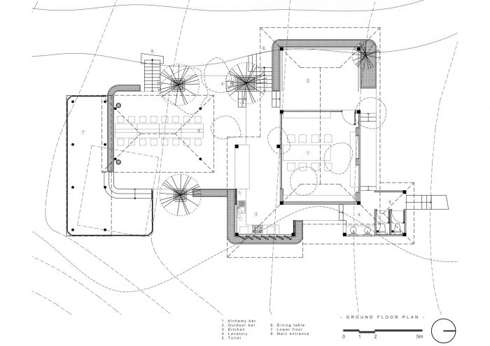 The project is a small bar and restaurant, located on a hillside overlooking the sea, where an organic garden and solar farm are planned. Bar, which organizes small activities related to essential oil extraction, is an essential oil extracted from natural ingredients such as lemongrass, rosemary, and flowers grown in organic gardens. The small restaurant, with a few tables for visitors, is located on the terraced floors according to the natural terrain, overlooking the sea, which is an ideal place to watch the sunset.