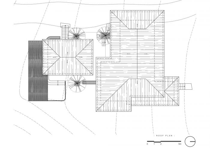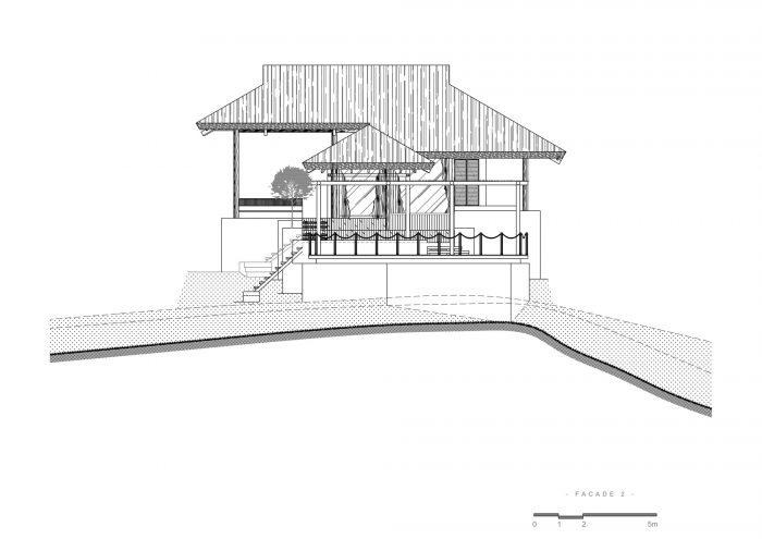 走向自然体验,这在越南是一个日益增长的趋势,促进传统建筑和自然景观的优势。我们以保持周围景观的野性的愿望来对待这个项目。该建筑由几个木质结构、茅草屋顶和交错的体量组成,同时还有顺应自然地形的倾斜木质地板,最低层位于现有水箱之上。该项目位于山坡上,相当高,在运输材料和保护周围树木方面有很多不利因素。