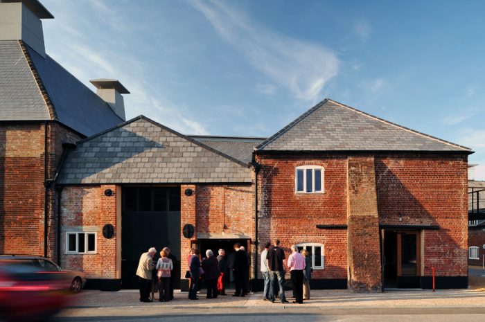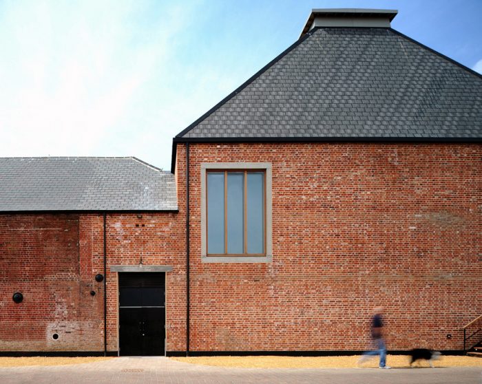 Aldeburgh Music's new creative campus at Snape Maltings opened to the public on May 9th. The project, part of a phased development of grade 2 listed 19th century maltings buildings at the edge of the Suffolk marshes, brings a range of derelict granaries and kilns into use as rehearsal and occasional public performance spaces grouped around a communal foyer. The centrepiece of the project is a new build orchestral rehearsal room, the Britten Studio, designed to complement the nearby concert hall (by Arup Associates, completed in 1970). The rehearsal room incorporates retractable seating for 350, enabling it to be used as a public venue. A second space, the Jerwood Kiln Studio, was converted from a derelict kiln and can also accommodate public performances when required. The central foyer and technical get in was formed from an existing granary sandwiched between older structures, its eccentric timber roof adapted and a new concrete mezzanine installed.