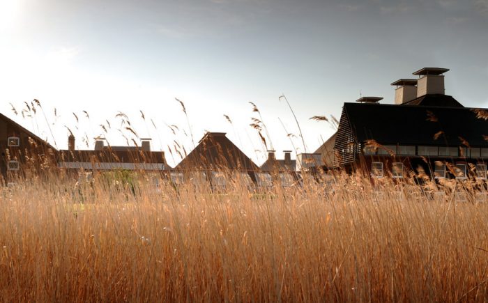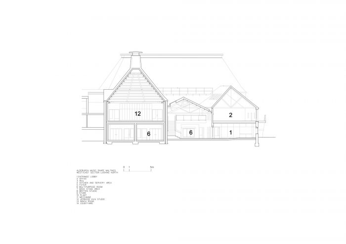 Musicians are drawn to Snape Maltings' unique sense of place, a combination of the austere industrial architecture and the wide, almost abstract landscape of the marshes. The newly renovated buildings seek to capture that sense of place, drawing on the surviving texture of the derelict buildings and making reference to the salty, astringent quality of the coastal landscape. The exposed, graded aggregate concrete walls of the Britten Studio, for example, are designed to recall the shingle beach at Aldeburgh, whilst the pale chestnut strip ceilings in the foyer refer both to the old lath and plaster walls found on site and to the undulating reed beds that surround the building. Both of these devices are primarily designed to establish optimal acoustic conditions.