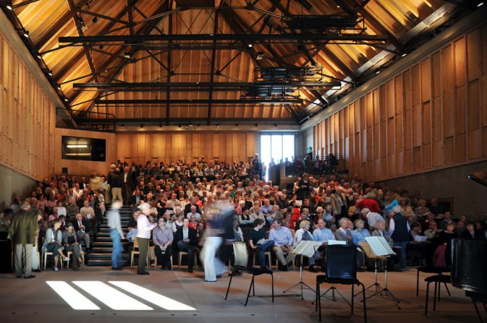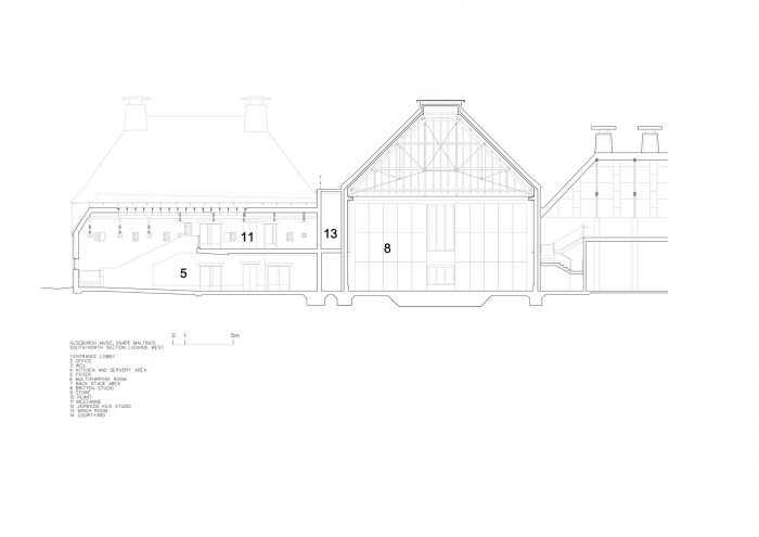 Materials used throughout the scheme were salvaged and recycled wherever possible, both to maintain the sense of history within the building and to reduce the embodied energy of the project. Agricultural roofing sheet and manmade slates (laid upside down to avoid an over polished finish) are used for economy but also to maintain a simple, unadorned aesthetic. Daylight is maximised throughout the scheme to maintain contact with the outside world during rehearsal and to reduce energy costs. Dual lighting systems (for rehearsal and performance) are incorporated to minimise energy usage.