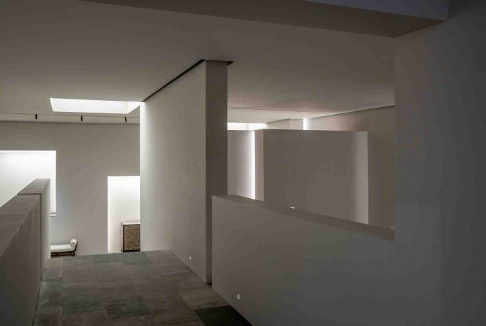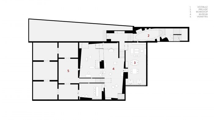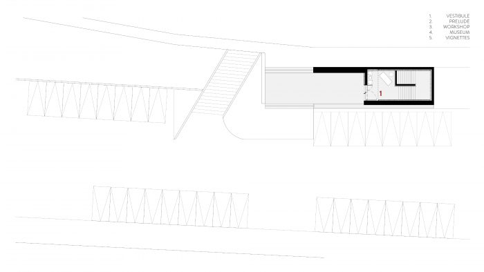 The dark meandering transitions into the Museum space. Volumes and voids generate layers of light, framing niches or creating openings in other spaces. Angled perspective plays a role in generating a feeling of ever-changing views. The design workshop is the first space at the Museum, it provides a view of the main gallery. Further down, the main gallery space is divided into different platforms and landings holding the main pieces of the exhibit. The intersecting of walls and ceiling creates voids that act as light wells washing the spaces from above. A staircase and bridge serve as articulating elements for the secondary spaces, dedicated to a more traditional type of exhibit.