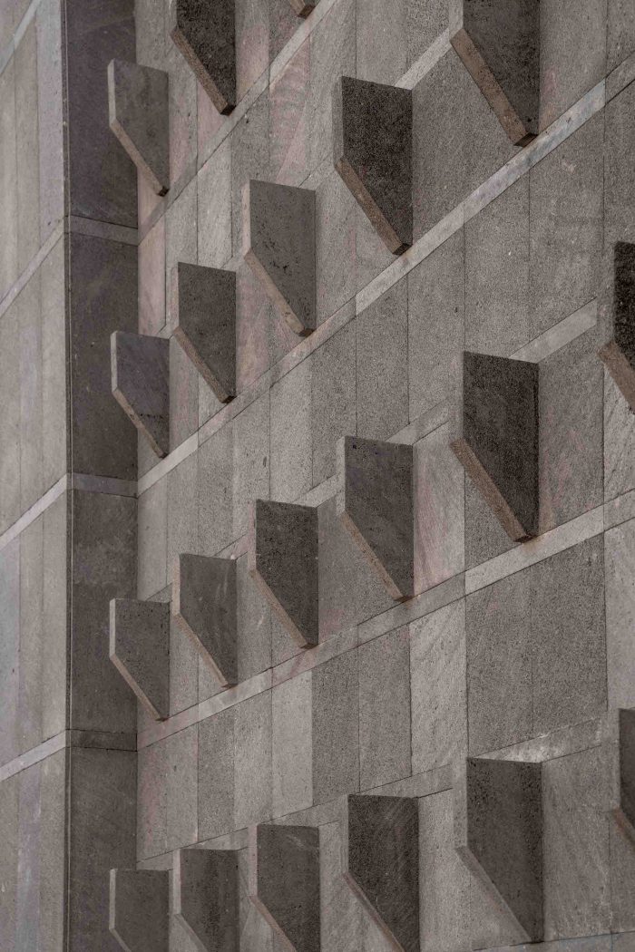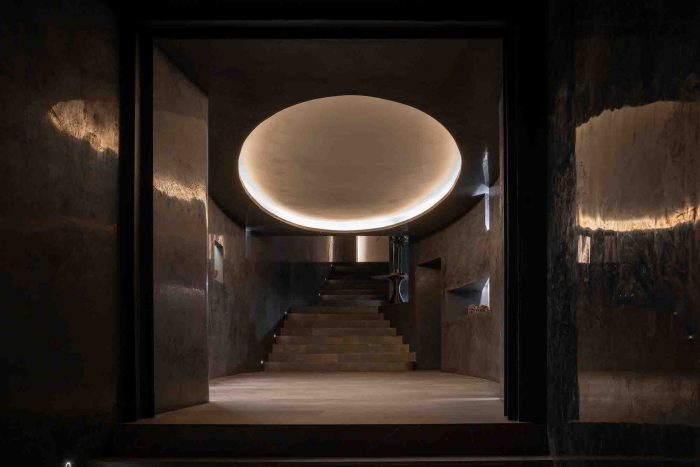 The stone façade serves as a canvas upon which the ever-changing nature of light and shadows is captured, a temple of craftsmanship and tradition. Upon entering the building, a staircase is framed by a wood ceiling and walls that express a warm rhythm. The path that continues down into the project as a threshold reinforces the idea of separation by enveloping visitors in shadow and contrasting dark materiality with accents and reflections of light. This builds anticipation towards the encounter with the main gallery.