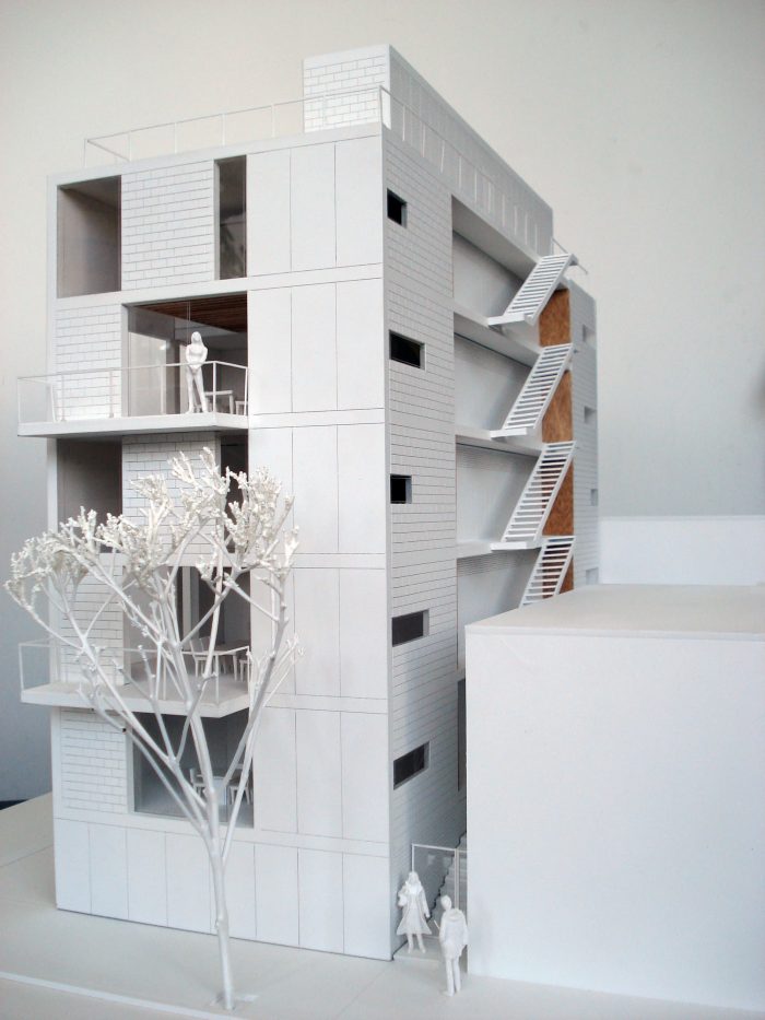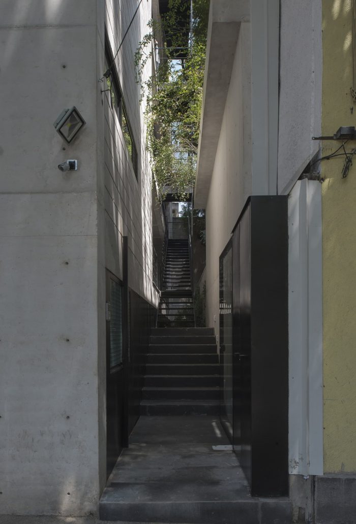 开口的构成被认为是缺乏刚性的墙,而不是外墙上的一个洞。在建筑内部,有八个住宅被设计成结合了一层和两层的类型。垂直循环被连接到与相邻体量的分离处,使这条小巷成为进入住宅的通道。