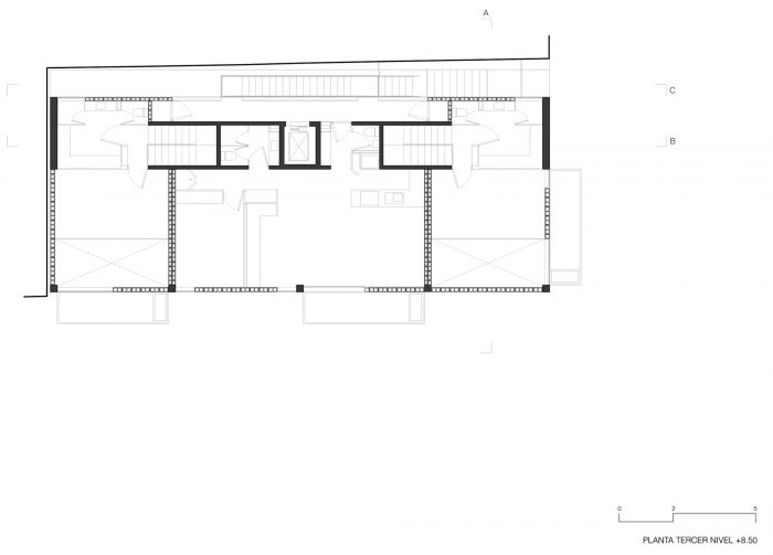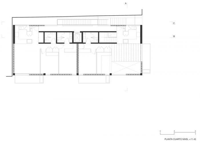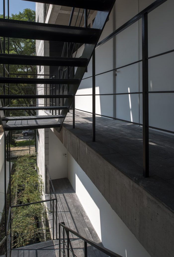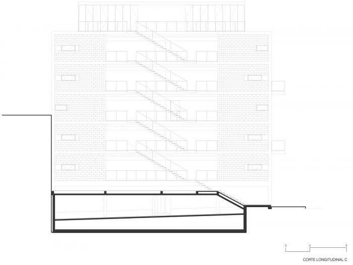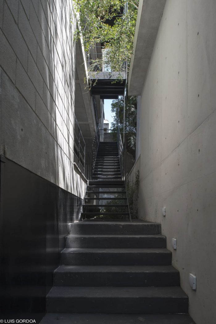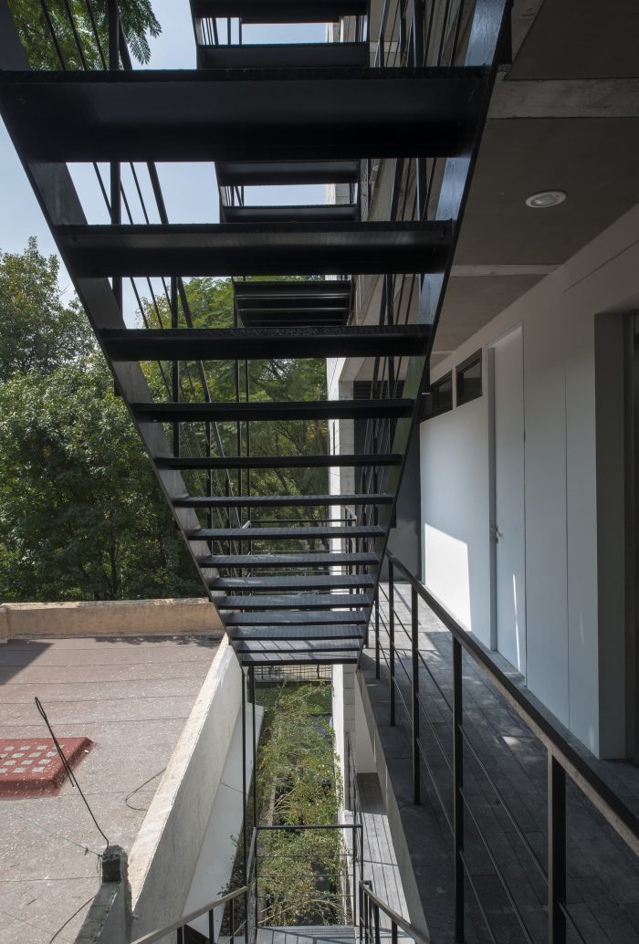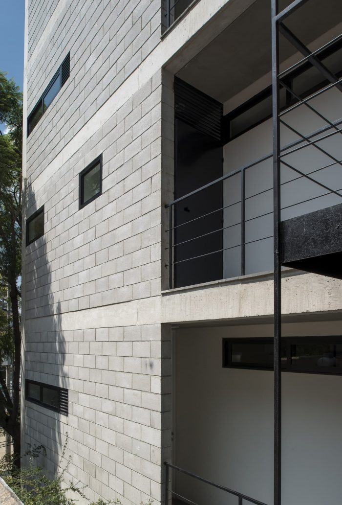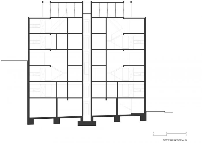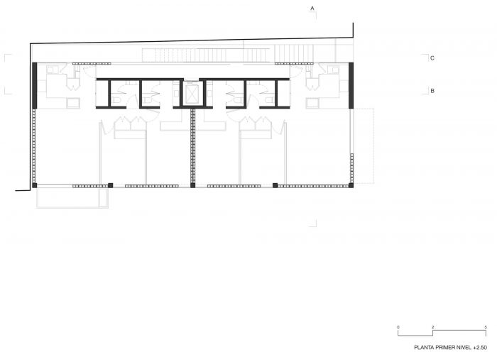 The composition of openings is posed as the lack of a rigid wall, instead of a hole in the facade. Inside the building, eight dwellings are designed combining typologies of one and two levels. Vertical circulations are attached to the volume at the separation with the adjoining one, making this alley the access to the homes.