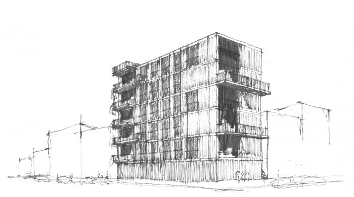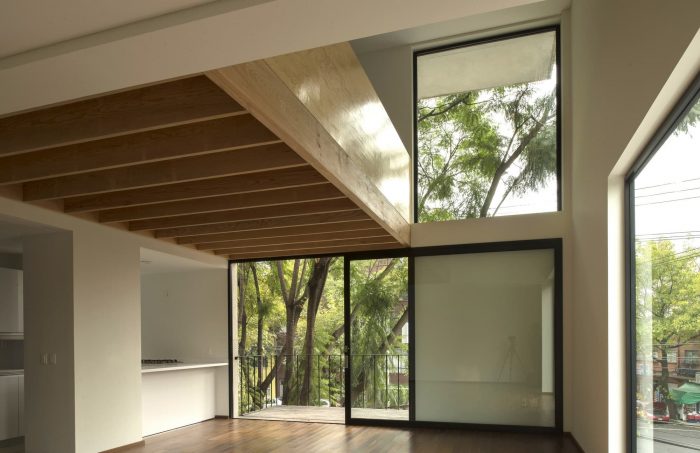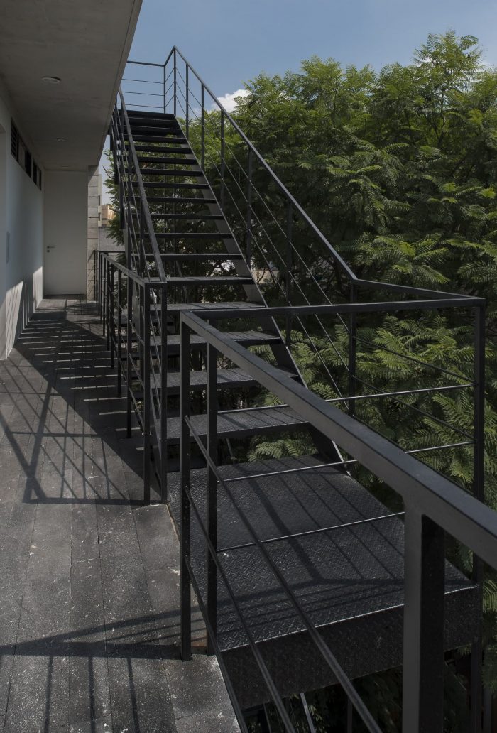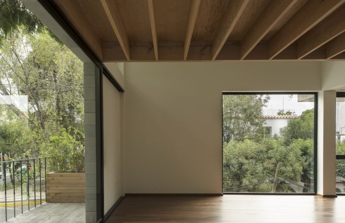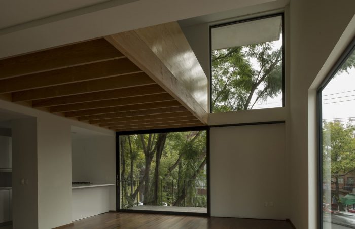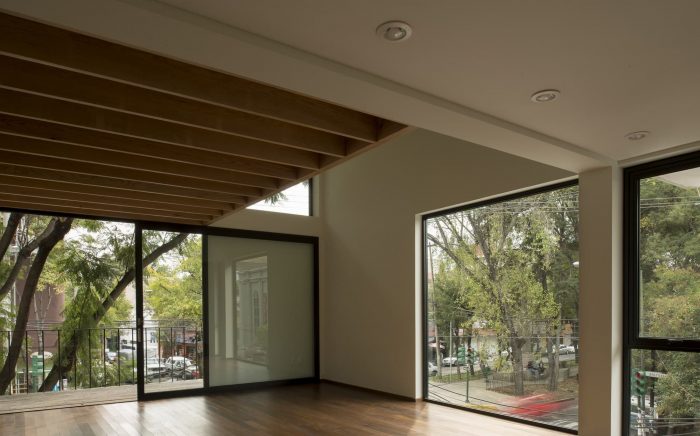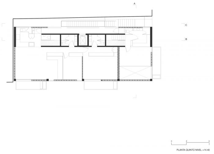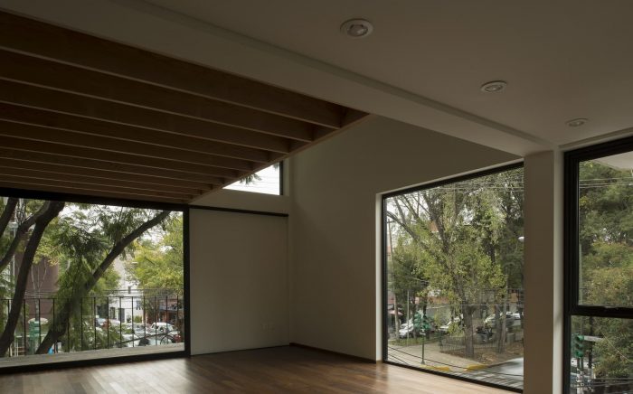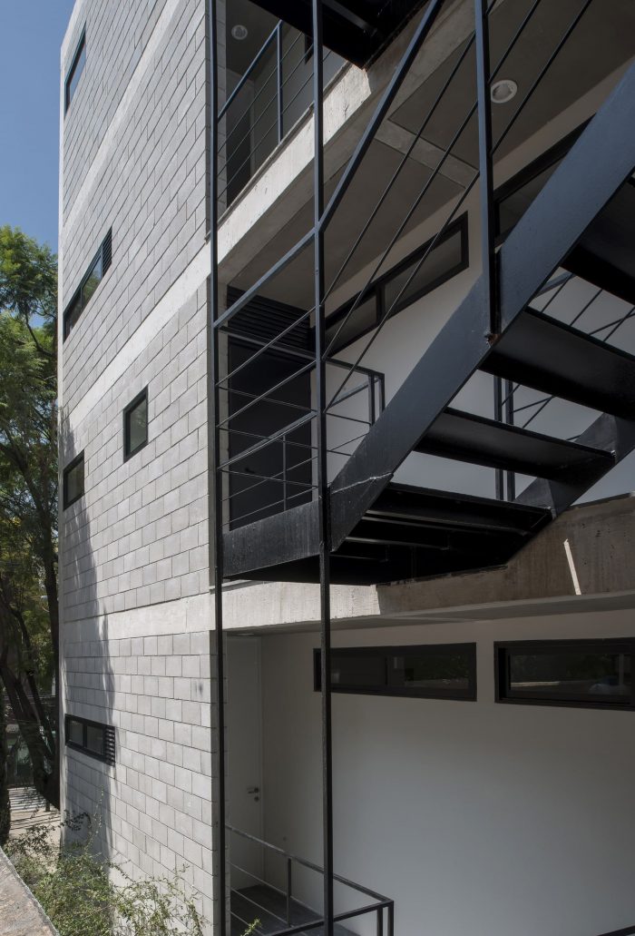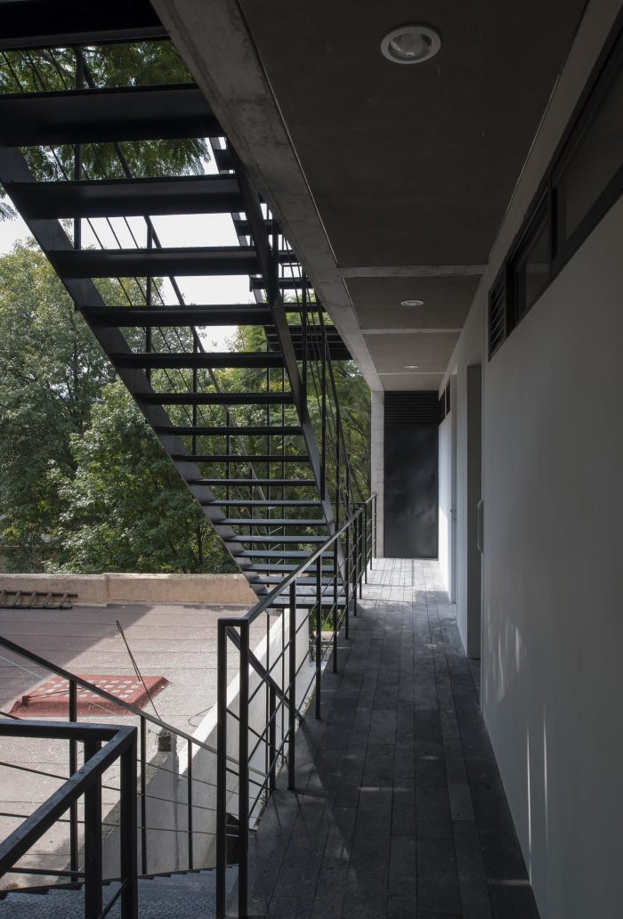 The composition of openings is posed as the lack of a rigid wall, instead of a hole in the facade. Inside the building, eight dwellings are designed combining typologies of one and two levels. Vertical circulations are attached to the volume at the separation with the adjoining one, making this alley the access to the homes.