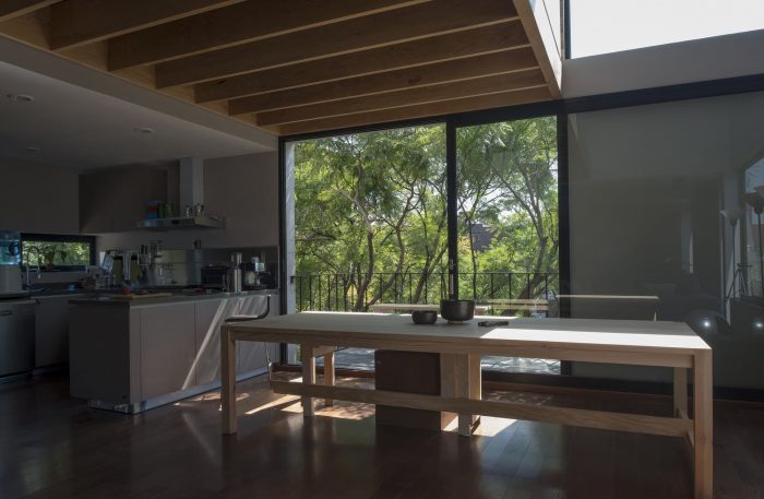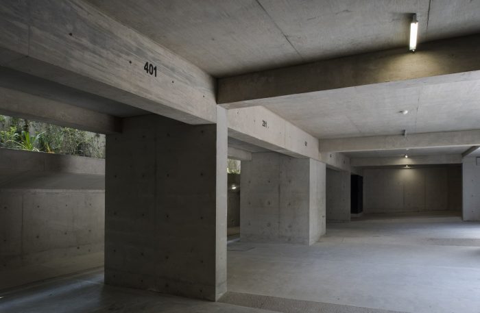 The structure is comprised of concrete rigid frames attached to walls of hollow concrete block, which provide additional rigidity to the structure. In the transverse direction, the building is divided into two structural bays, the first (towards the long boundary) functions as a rigid services core, circulation, and kitchens, and the second (towards the street) functions as a light bay of lightened slabs, wooden lofts and light walls.