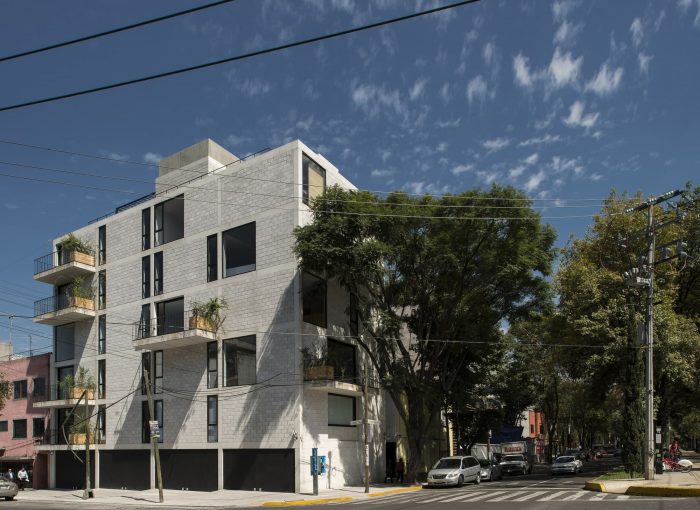 The commission was to design a building for 8 dwellings on the corner of Alfonso Reyes Avenue and Saltillo Street, in Colonia Condesa. The project approach separates the building from the long boundary, in order to design the corner with a single gesture 17 meters high, where the resulting volume is expressed through its structural rhythm in counterpoint to the openings and balconies on the facade.