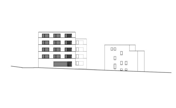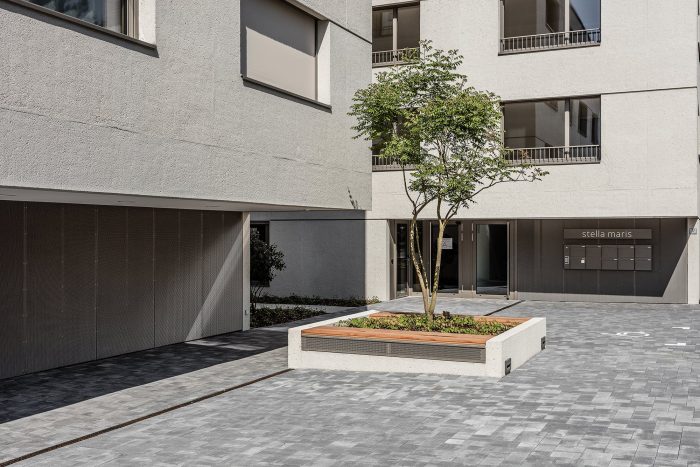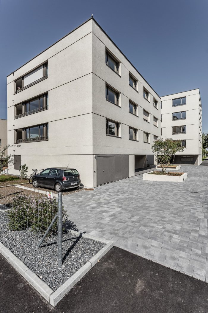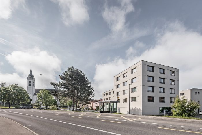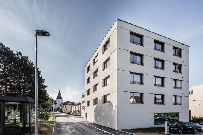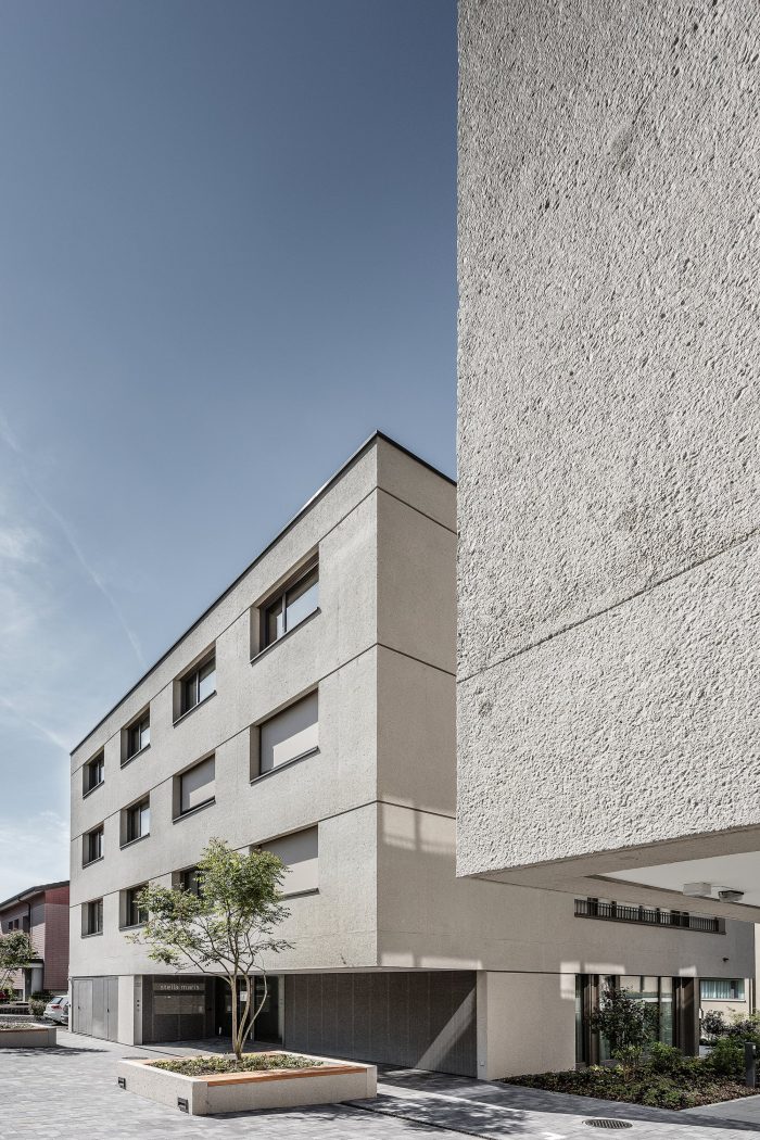 Both buildings manifest fair-faced concrete with a sandblasted façade, which is structured by horizontal joints. The additive arrangements of the punched windows provide an even overall appearance of the façade. There are a total of 15 retirement apartments, divided into 2.5 and 3.5 room accommodations.