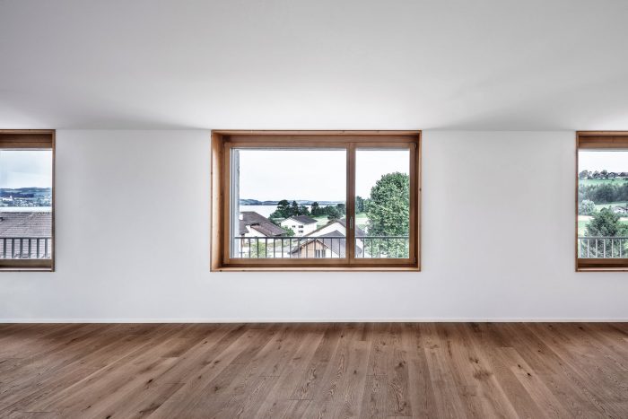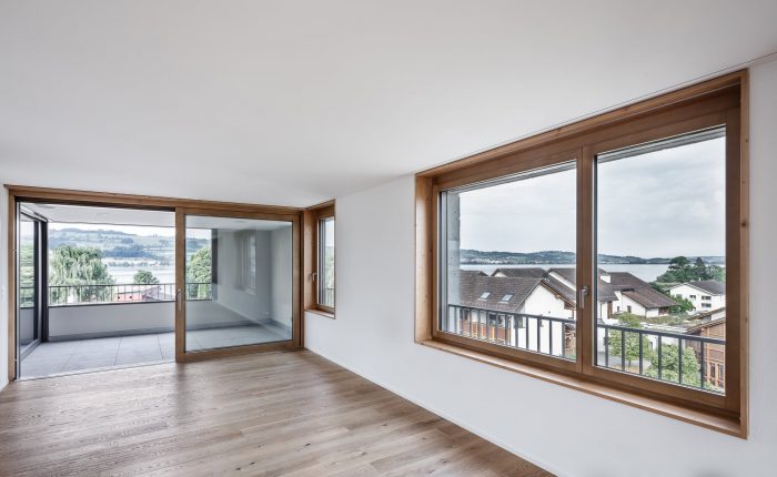 Floor plans, transportation infrastructure, and materialization were considered with respect to age-appropriate living. Both volumes present a core structure with staircases and spacious elevators. The apartments convince with a trilateral illumination of the living- and dining area, as well as two-sided loggias, with a view of the lake from the upper stories.
