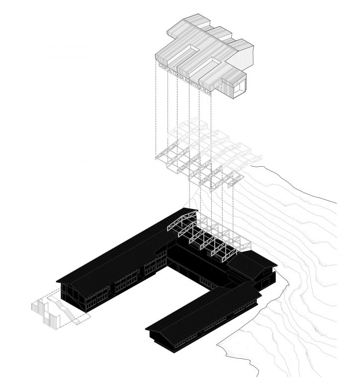 It is an intervention in a building with deep foundation in all its depth, the proposal is limited to the projection in the existing floor, avoiding extending the limits beyond the existing alignments and rationalizing the investment to avoid new deep foundations. As far as possible, the existing structure is reused. The metal structure of the gym is not dismantled, but it is built on with the necessary modifications. The current networks are transformed into trusses to be able to increase the lights and displace the supports of the west façade, making them compatible with the new distribution. The flight to the west of the truss partially compensates for the increase in light between the proposed pillars.