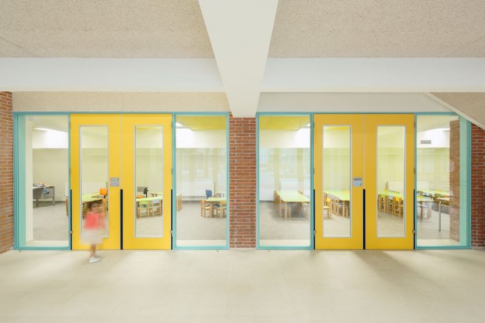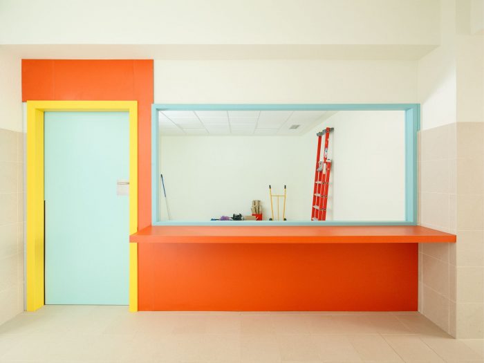 The clarity of the circulations and the use of color as tools to build a warm environment for the first contact with the social and cultural dimension of its small users. The intervention expands the classroom program in three units and adapts the program of common uses accordingly. The project replaces the volume of the gym superimposed on the building by the expanded teaching program. The nucleus of internal stairs is relocated and an elevator and evacuation exits are incorporated in the front walls to comply with current regulations.