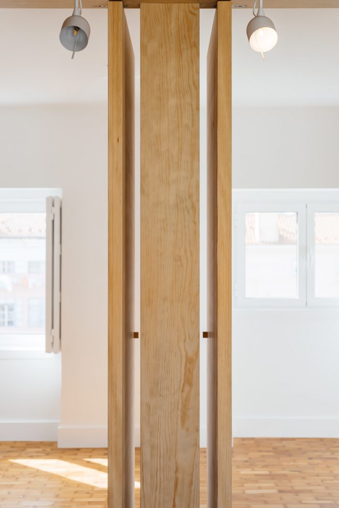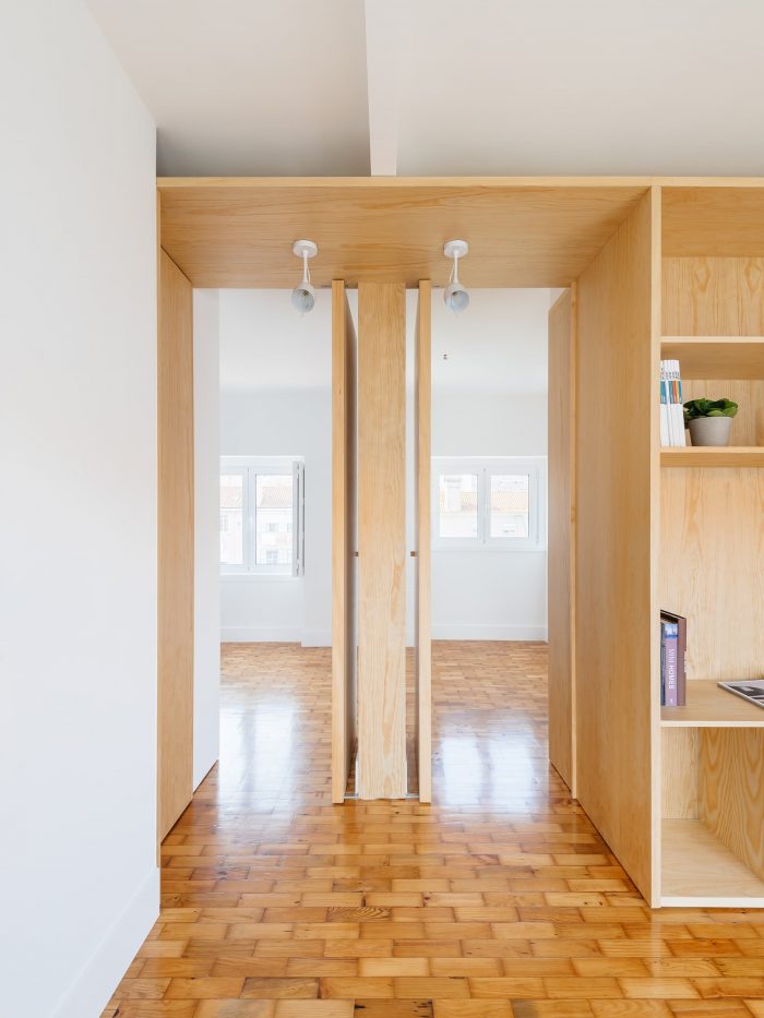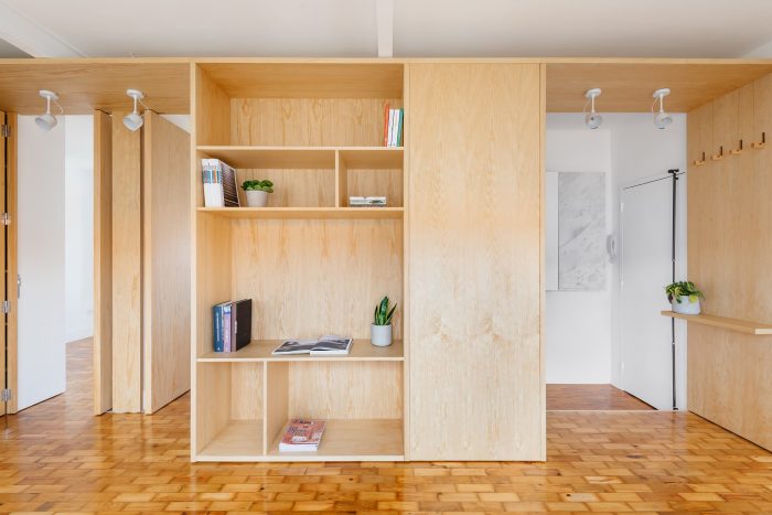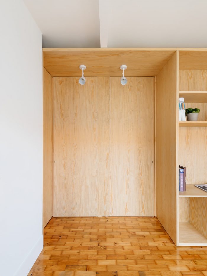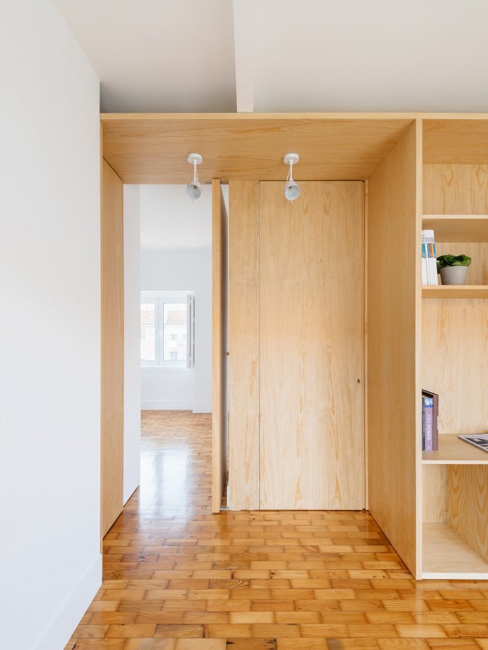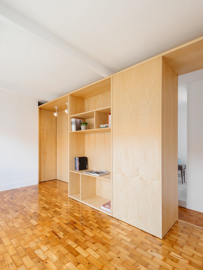 Separating the kitchen from the rest of the area is this piece in birch plywood that begins in the hall by making a cloakroom and that, combined with the differences of dimensions on the floor (due to technical issues), allows the transition of areas and organization of spaces. This "box" that runs through the whole house houses the laundry room, a bookcase for the living room, and the entrances of the rooms and sanitary installation. The material contrasts with the rest of the predominantly white apartment, which also hides the entrances in the most private areas of the house, since the pivoting doors, in the same material, function as practically hidden planes in the configuration of the piece. Thus, the occupation of the living room/ dining room becomes vastly wider, as the corridor is destroyed, both physically and visually.