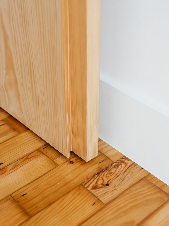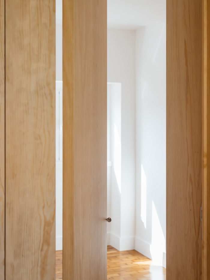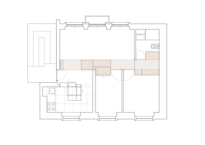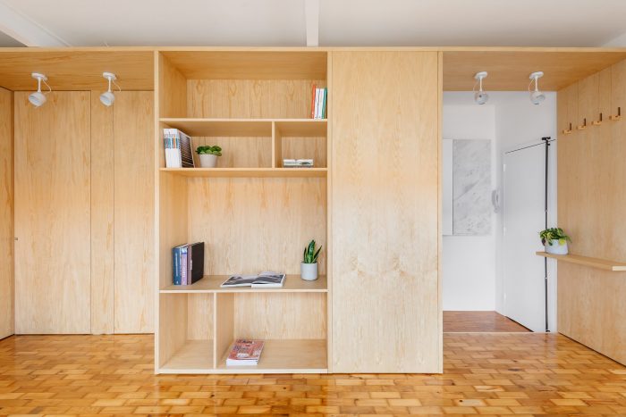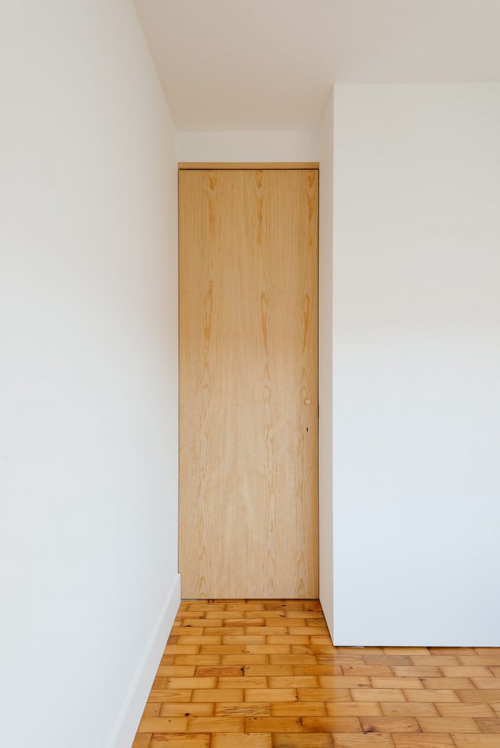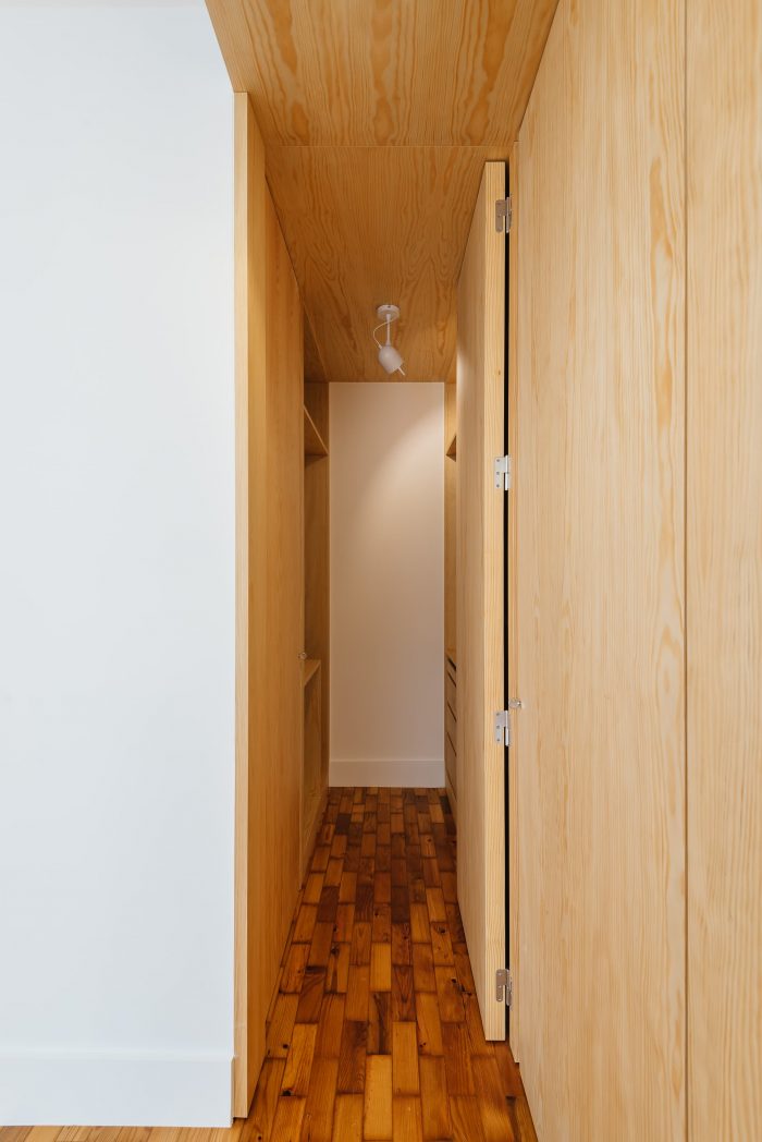Separating the kitchen from the rest of the area is this piece in birch plywood that begins in the hall by making a cloakroom and that, combined with the differences of dimensions on the floor (due to technical issues), allows the transition of areas and organization of spaces. This "box" that runs through the whole house houses the laundry room, a bookcase for the living room, and the entrances of the rooms and sanitary installation. The material contrasts with the rest of the predominantly white apartment, which also hides the entrances in the most private areas of the house, since the pivoting doors, in the same material, function as practically hidden planes in the configuration of the piece. Thus, the occupation of the living room/ dining room becomes vastly wider, as the corridor is destroyed, both physically and visually.