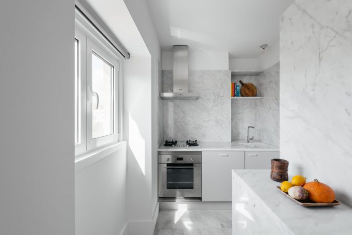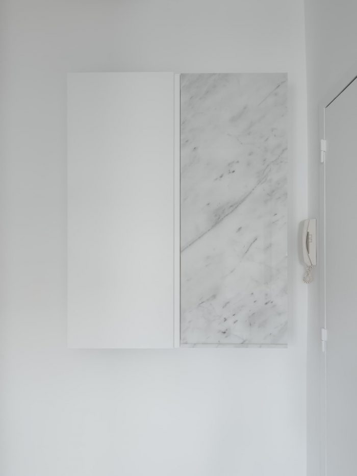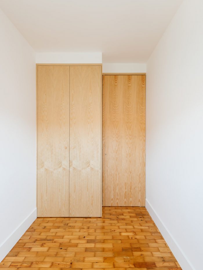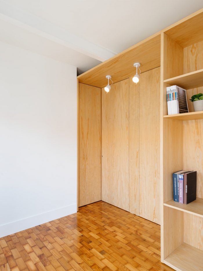 In regards to the materials, the original wood floor was maintained (with a new draw) and the walls painted white, evidence the central element in birch plywood, enlarging the natural light that enters through two chest windows and a balcony. In the kitchen and sanitary installation, we opted for materials with neutral tones, such as Ibiza marble stone and ceramics with gray patterns, in order to enhance the light, due to the small area of these spaces.