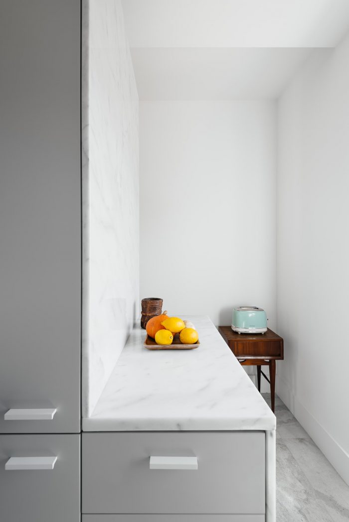 The kitchen remained in the original area of the house, but with a completely contemporary design, enhancing the storage through niches and optimizing the space while producing a lightness that previously did not exist. The bench was enlarged, through the installation of a peninsula that also includes the refrigerator and storage also. The shelf placed under the window allows quick meals, without the use of the dining room.