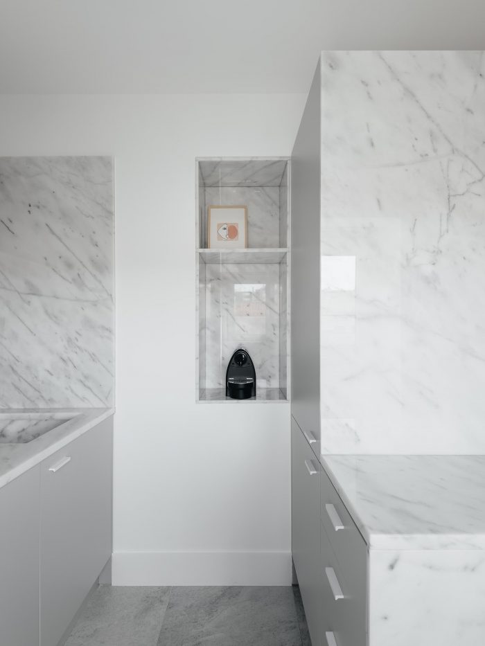 在材料方面,原来的木质地板被保留下来(有一个新的抽屉),墙壁被涂成白色,证明中心元素是桦木胶合板,扩大了通过两个胸窗和一个阳台进入的自然光。在厨房和卫生设施中,我们选择了中性色调的材料,如Ibiza大理石石材和灰色图案的陶瓷,以加强光线,因为这些空间的面积很小。