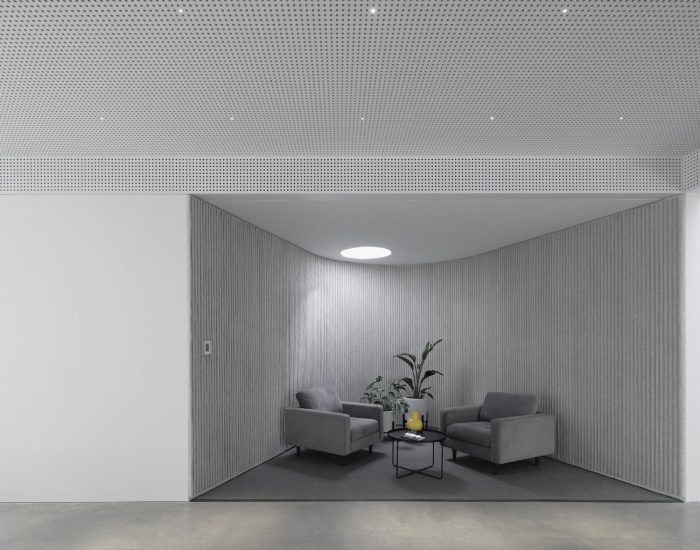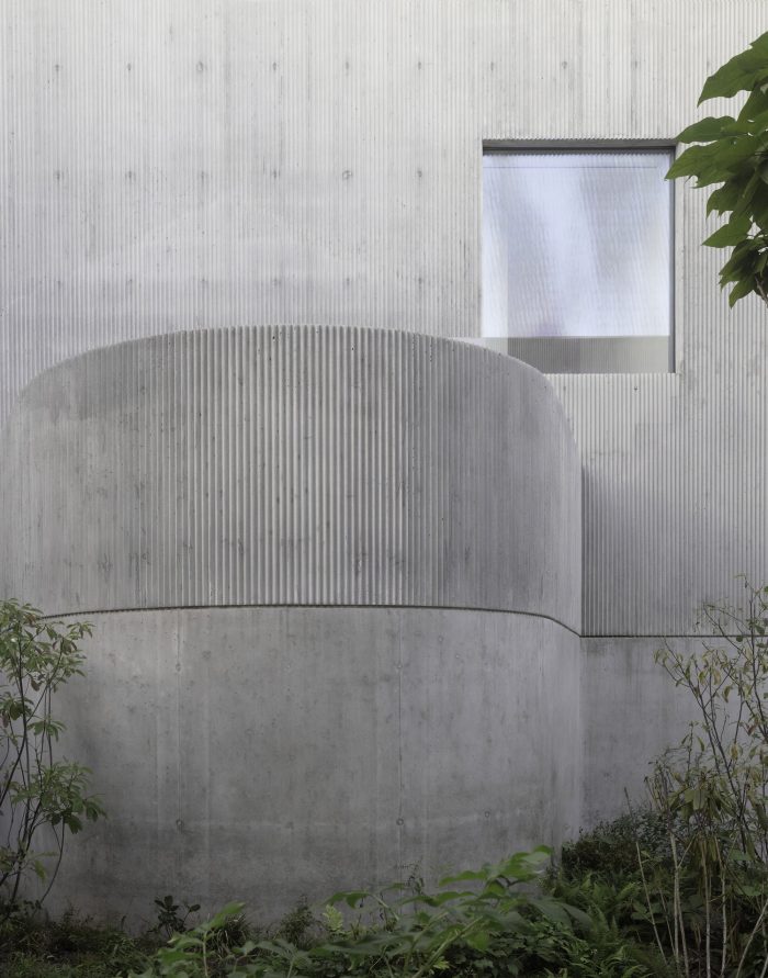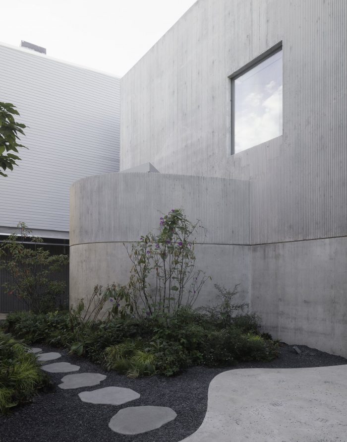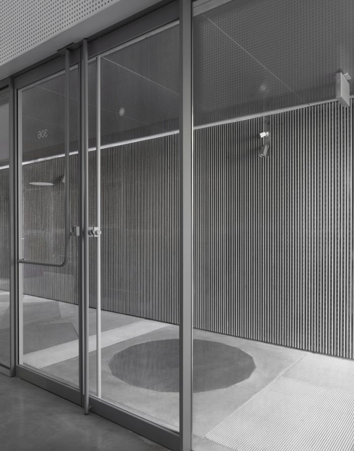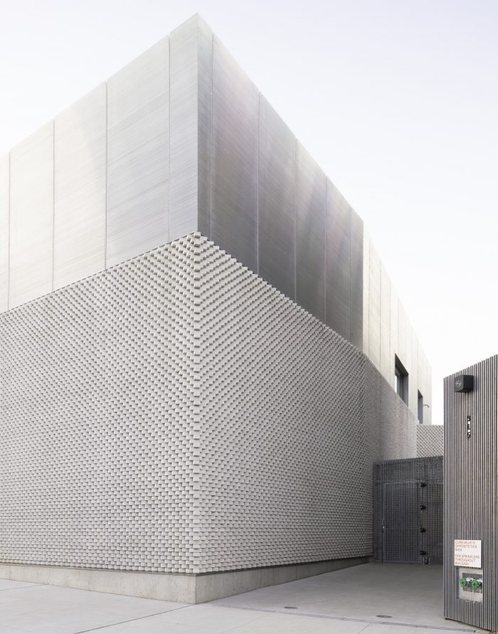 Materials render the buildings partly anonymous. Deeply textured form liners shape cast-in-place concrete. Bricks rotate out of plane to catch shadows. Galvanized steel bars toy with reflection and transparency. Each building nestles comfortably within its industrial context, offering surprising tactility, detail, and depth up close that betrays the familiar and the everyday.