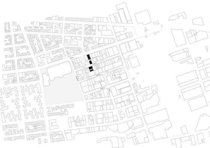 分布式的体量没有与城市环境相隔离,而是与城市的结构相交织。有多个入口的户外空间提供了无数的机会与周围的社区联系起来,同时为城市的强度提供了避难所。穿过大型城市街区的公共路线创造了新的流通和发现方式。庭院和大道穿过现有的建筑并在它们之间穿行,将游客从外围的私人空间带到位于中心的画廊和展览。