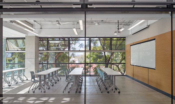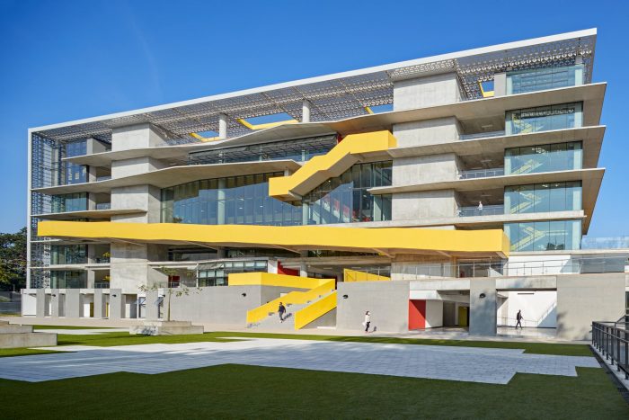 The project’s bright colors, sculptural form, natural materials, and crisp design are inspired by Guadalajara’s cultural heritage and rich combination of traditional and modern architecture. Drawing from Mexico’s cortile buildings, courtyards, and public sculptures, the school’s design embraces the city’s architectural history and fosters community identity through themed colors.