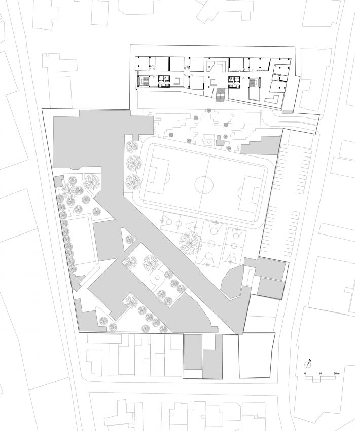 郁郁葱葱的绿色空间将学校与户外联系起来。植被的部署是有策略的,少用耗水的植物,在次要的花园区域放置低水的本地植物。植被通过改善空气质量创造了一个健康的环境,而树木通过提供遮阳板减少了太阳辐射。在城市环境中,绿色植物作为自然的出口,使人的精神焕发活力。