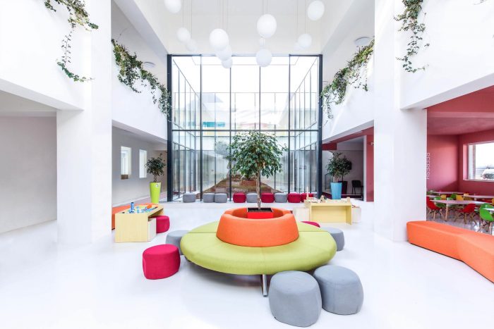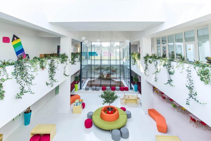 幼儿园的特点是中央长廊,它将所有周围的空间与内部中庭连接在一起,中庭内生长着多年的橄榄树。这棵树给人的印象是,它将一直在那里,并将被一代又一代地传递下去。橄榄树知道所有的学生,它知道他们中的哪些人将成为未来的领导者!。不时地,它给人的印象是一个从外面表达爱的祖父。来自上方的照明为画廊增加了艺术价值,并为许多功能创造了空间,一句话,创造了生命。