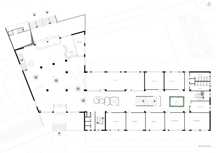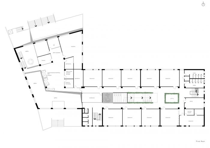 The ground floor, which holds the main entrance as an important element with a fairly flexible space, enables to be held various activities. This space is filled with green and has a three-gallery auditorium, which connects the three upper floors. The galleries and the auditorium are exposed by natural zenith lighting, which make the school function as a entirety.