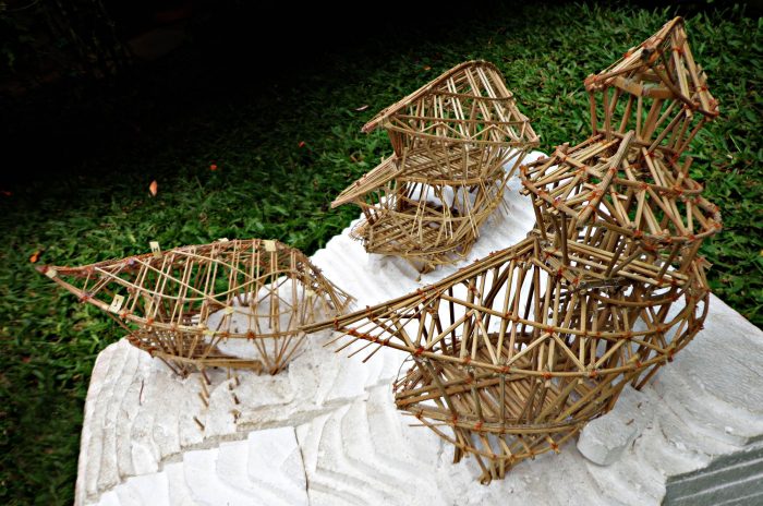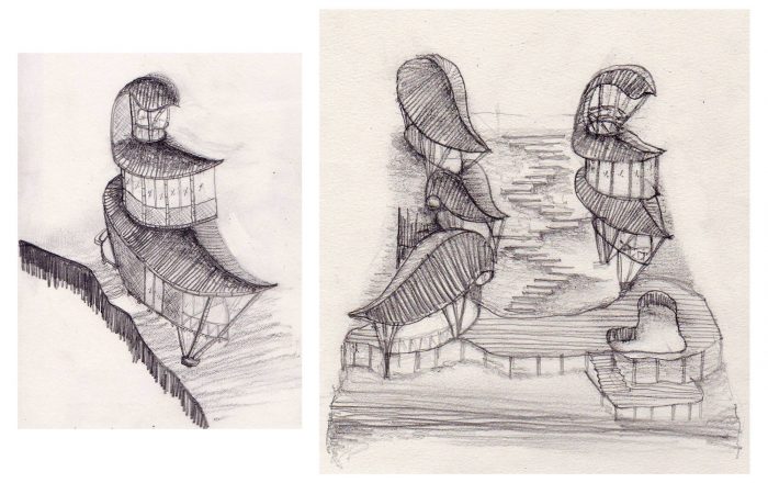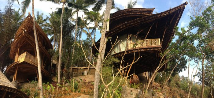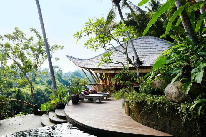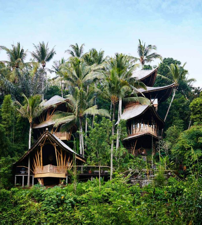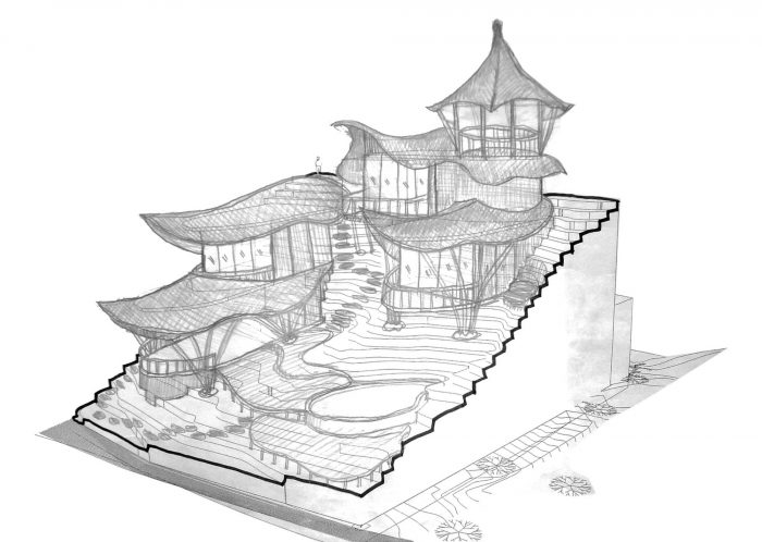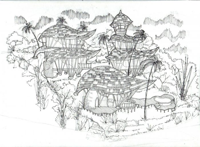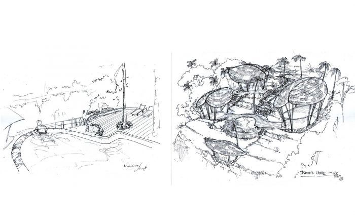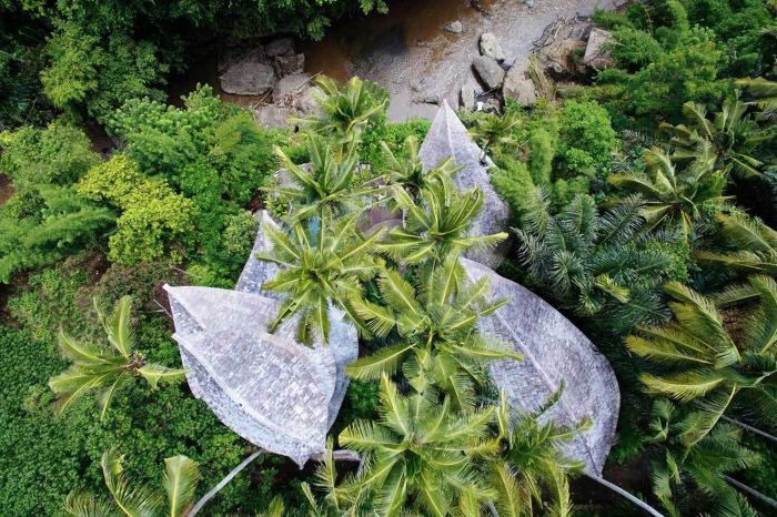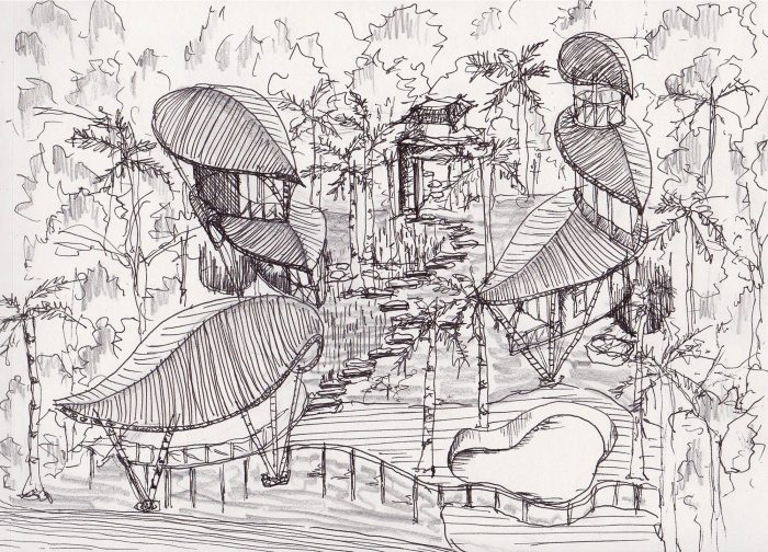 A simple stone gateway marks the entrance to the house. The gateway frames three young black palms surrounded by a corridor of green that cascades down the land. Sunlight pours into this east-facing slope in the morning when there is still a touch of dew on the leaves, and in late afternoon the lost fingers of golden light angle down through the fronds. A stone pathway winds along the contours of this terraced garden. Pathways branch off the main stone path to left and right at intervals along the contours, leading to two delicate multi-level structures, perched like birds that have nestling into the slope. The curving leaf-shape roofs sweep low around the sides, and under them you can see a glimpse of glass which reflects the green of the garden, and white curtains flowing. These are the private bedrooms, and at the front of each is a private balcony pointing east towards the valley.