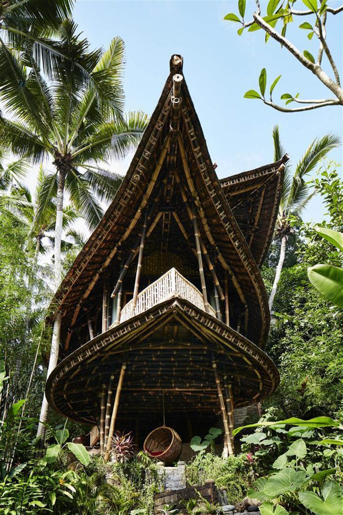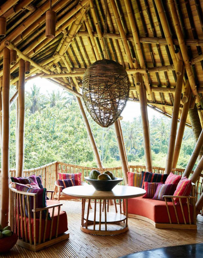 这个房产的戏剧性和美感从第二个生活空间中得到了最好的体现,它设置在主卧室的上方,偏向东北方向,直接指向巴厘岛的母亲山--阿贡山,在晴朗的日子里可以在地平线上看到。这个房间,与家庭凉亭不同,可以用高大的玻璃窗完全封闭,在炎热或暴风雨的日子里,成为家庭的退路。黎明时分,日出的光线会从屋顶的升降机中涌入,将其变成一个金光闪闪的书房。