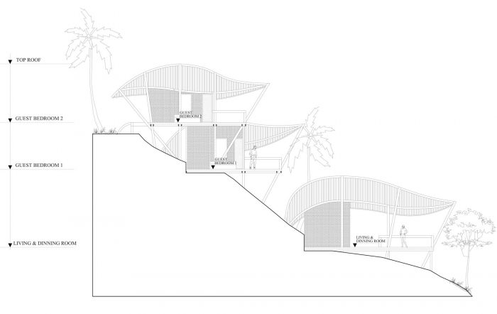 一个简单的石门标志着房子的入口。门口有三棵年轻的黑棕榈树,周围是层层叠叠的绿色长廊。清晨,当叶子上还有一丝露水时,阳光倾泻到这个朝东的山坡上,而到了下午,迷离的金色光线透过树叶向下倾斜。一条石板路沿着这个梯田花园的轮廓蜿蜒前行。小路沿着轮廓线每隔一段距离就从主石路上分出一个分支,通向两个精致的多层建筑,就像依偎在斜坡上的鸟儿。弯曲的叶子形状的屋顶低低地扫过两侧,在它们下面,你可以看到一丝玻璃,反射出花园的绿色,白色的窗帘在流动。这些是私人卧室,每间卧室的前面都有一个私人阳台,朝东指向山谷。