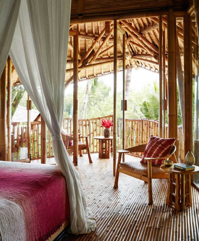 Several terraces above the deck, where the central pathway branches left to where the couples’ bedroom house is nestled. It has an upper and lower bedroom, each room with its own private balcony and bathroom. These rooms are a sweet and cozy place forest and retreat, just the right size for a queen bed and desk, with space for a crib or toddlers cot to be set up beside when needed. The bed faces tall glass windows toward the balcony and the north-eastern views beyond.