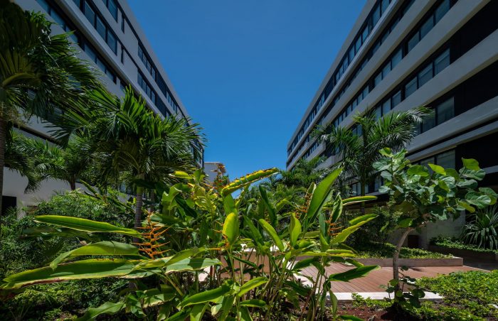 a, located between the two buildings. The central idea was in effect to provide all the interior spaces with views towards vegetative areas, but at the same time, help block some views between both buildings, or at least, prioritize them towards spaces that provide serenity to the tenants. This space is the lung of the project.