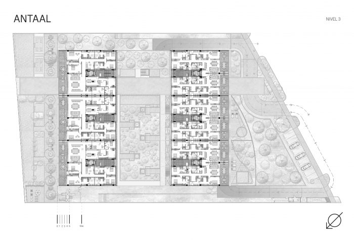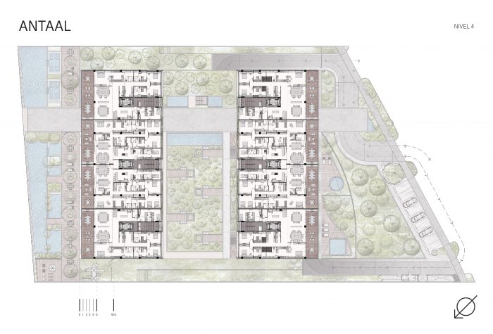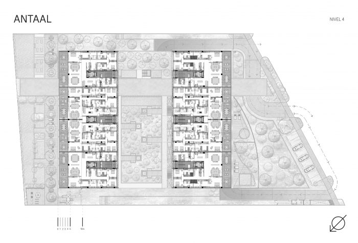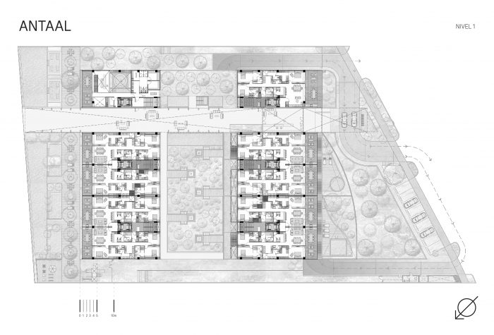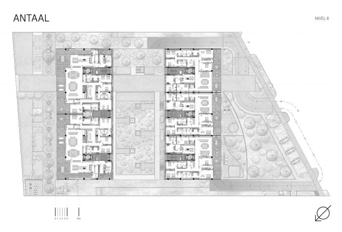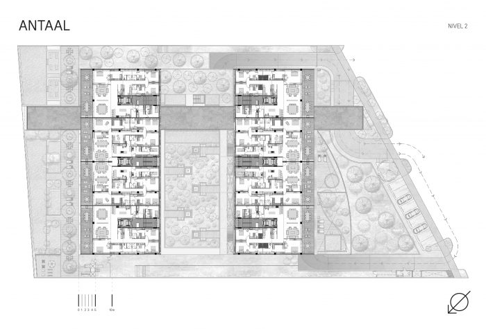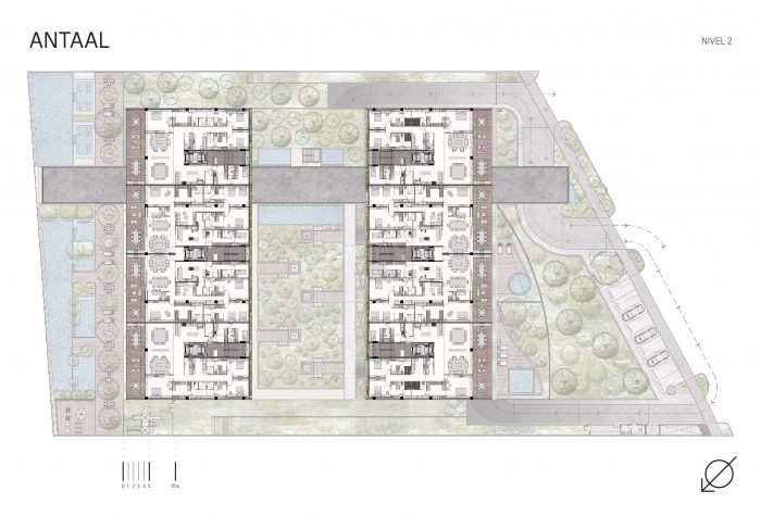 在这个中央庭院里有一些聚会点,在那里可以进行不同的社会活动,被大自然所包围,有必要的隐私,使用户感到在一个舒适和亲密的空间。同样的设计理念也被用于游泳池的设计中,以便能够与建筑群的其他用户一起在开放区域,或者与家人或朋友一起享受私人体验。