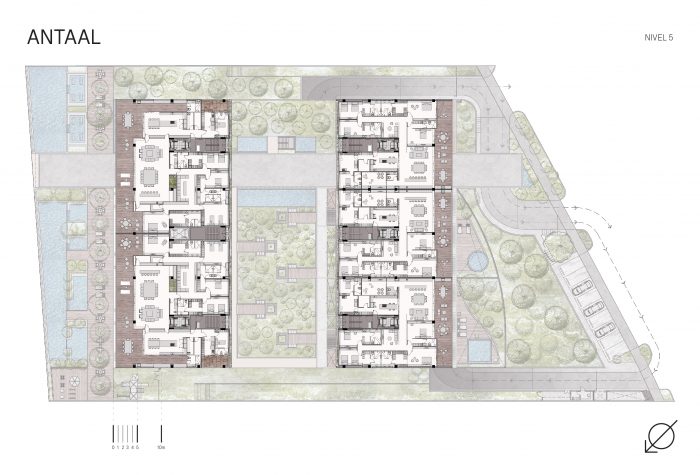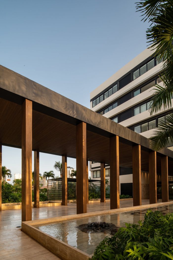 Within this central courtyard there are meeting points where different social activities can be carried out surrounded by nature, with the necessary privacy to make the user feel in a cozy and intimate space. This same design concept was used in the design of the pool, in order to be able to be in open areas with the other users of the complex, or to have a private experience with family or friends.