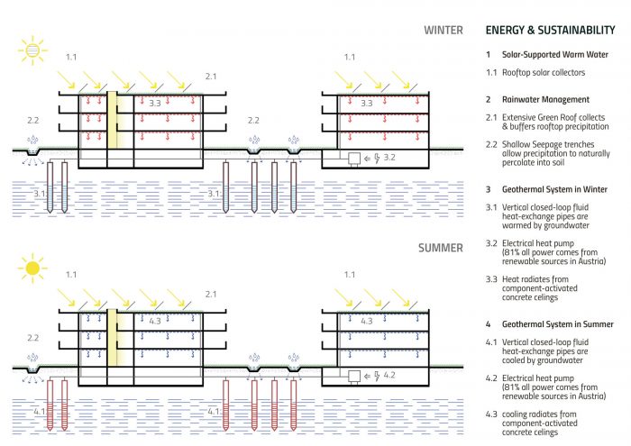 Importantly, ASG is a climatically responsible and use-neutral building that consumes a minimum of energy from fossil-fuel sources. Groundwater heat-pumps, powered by Vienna’s highly ecological electric grid (81% of electricity from renewable sources Austria-wide), use component-activated concrete floor decks to heat in winter and cool in summer. This seasonal heating /cooling cycle ensures that the local ground-water temperature remains constant.