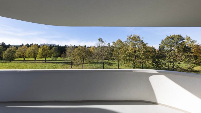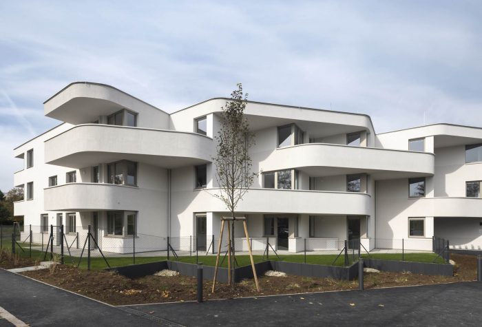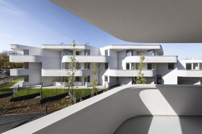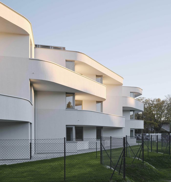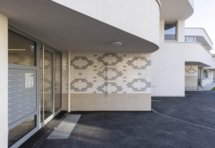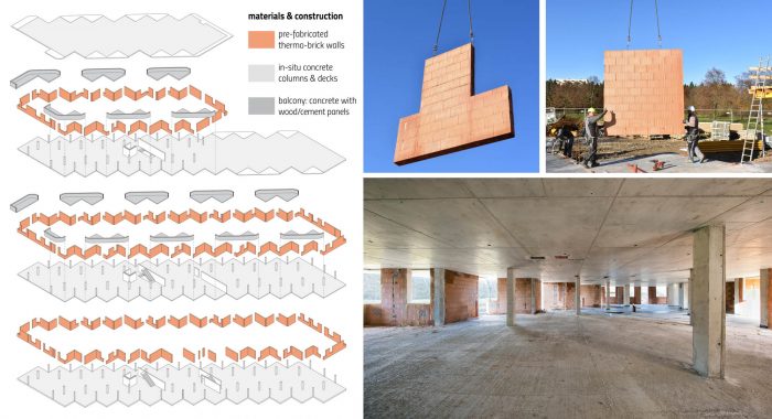 Sets of curved balconies – extrapolated from the grid – provide the apartments with outdoor space and lend the architecture its expressive note. Exacting planning and the application of cutting-edge building technology reduced construction costs for the building's shell. Exterior carrying walls are built from robot-assembled, prefabricated brick walls, and the project's grid is precisely coordinated with industry-standard dimensions for poured-in-place shuttering.