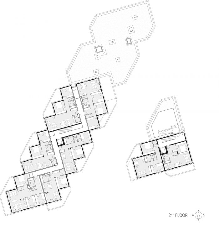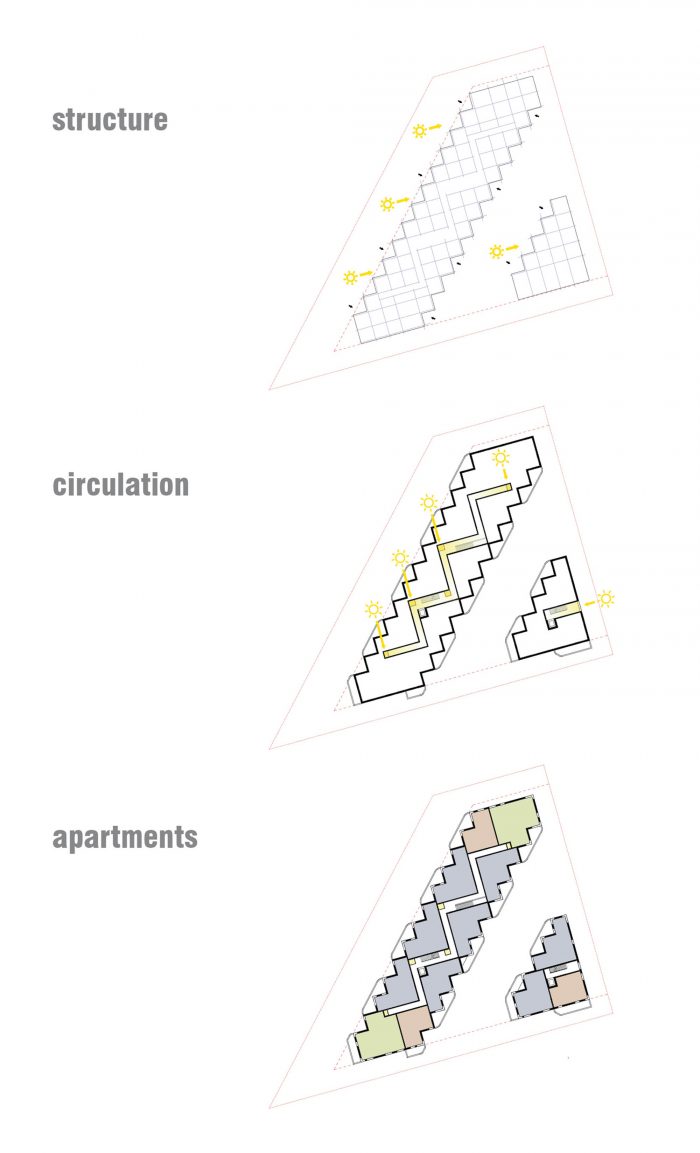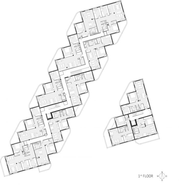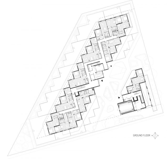 The project develops out of this park-side edge. Its long, northwest-facing front is given a serrated facade to enhance natural lighting and optimize views. This saw-toothed configuration becomes the organizing principle for the estate. It generates an offset grid that locates structural axes, subdivides space, organizes the sky-lit corridors, and creates distinctive floorplans with an unusually high ratio of the exterior wall to floor space.