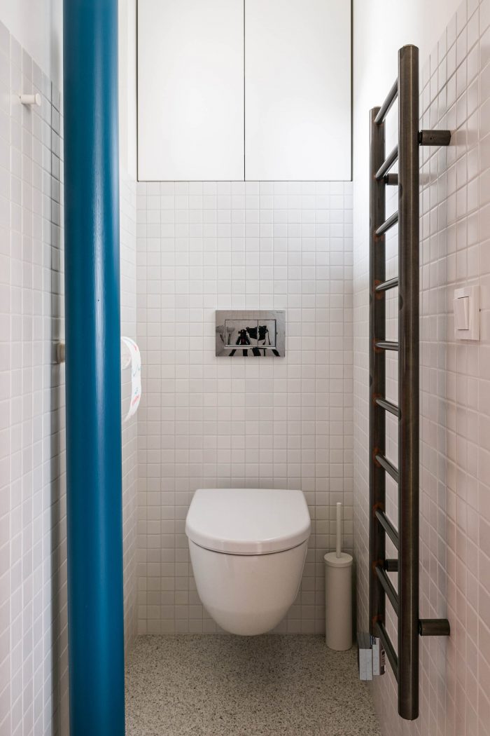 室内以白色为主,与入口处的淡色水磨石地板相一致。调色板的概念建立在白色和明亮的原色之间的对比上。在厨房和浴室的白色瓷砖背景上,红色和蓝色元素突然出现,作为色彩的点缀。这一室内原则在公寓的其他地方也得到了重复。
