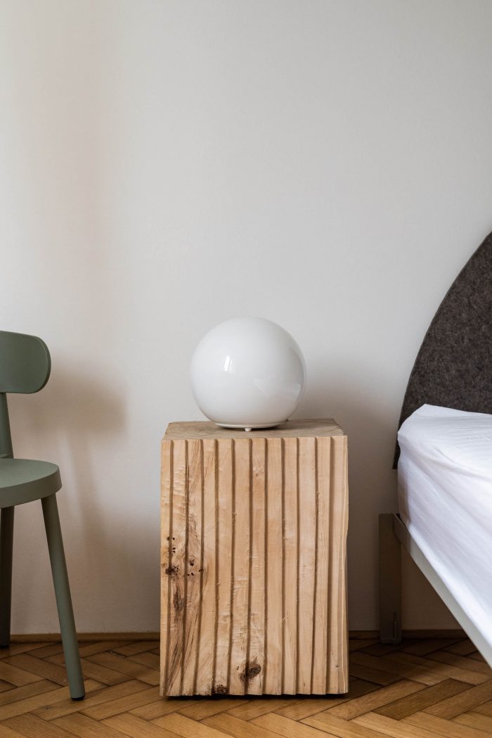 The apartment H is located along Medena Street in a building block from the ‘40s. The three-room apartment lacks the high ceilings and axial enfilade which are a staple of the surrounding apartments built during the time of The First Czechoslovak Republic (1918 – 1938). Despite this, with its rational disposition, the apartment remains evocative of these spatial principles. The central axis of the original corridor spans the apartment from the entrance through the main living space, and continues through the double-wing glazed door to the master bedroom.