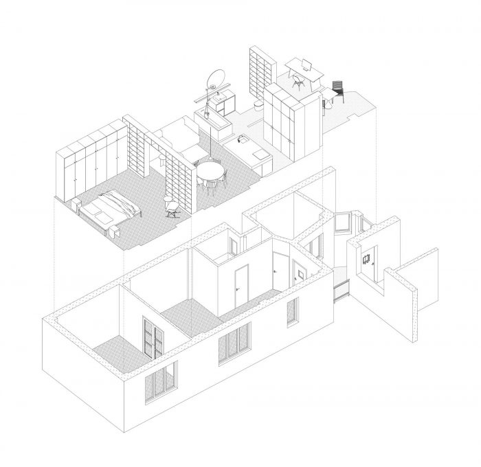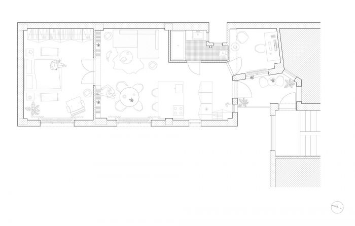 At the same time it references the partitions and doors that were erased in the reconstructed layout. The kitchen counter overhangs into the living room zone. The former kitchen became a separate study room.