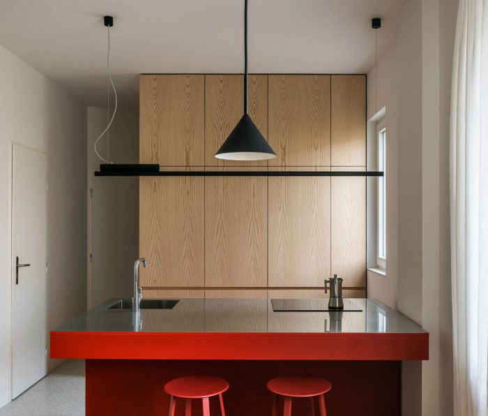 A ceiling-tall wardrobe creates a separation between the main entrance and this living space. Passing from the entranceway, a strong visual connection is established along the apartment’s central axis. The solid red-coloured volume of the kitchen optically balances out the apartment’s disposition.
