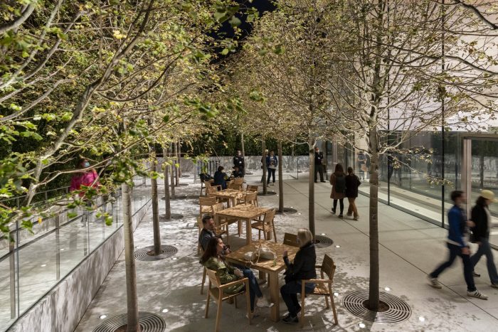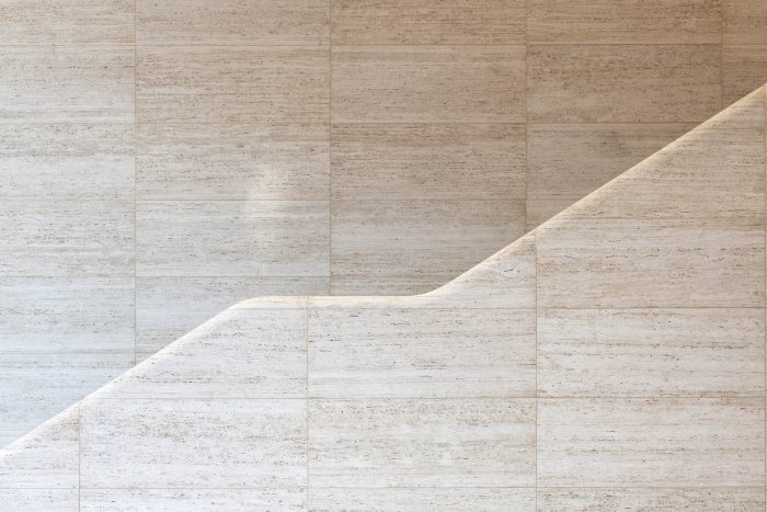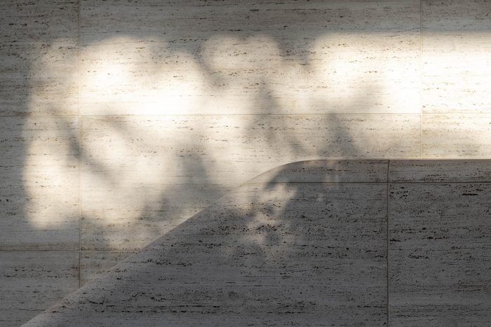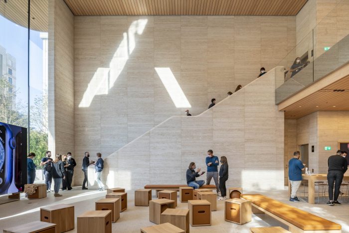 The building appears as a simple single story volume at the main street level with a floating roof above. Using the same stonework as the pavement, the carefully designed steps and slopes along the forecourt create a gentle transition towards the store entrance. The glazed facades offer a glimpse through to the lush tree-filled garden at the back, drawing people into the store. Visitors enter the building at the upper ground level, which leads into a spacious double-height volume. The large tree-filled pocket park draws people through the store, providing a natural sanctuary for visitors to relax under the shaded canopy of trees. The garden is enveloped by a tall green hedge, immersing visitors in its natural environment and adding welcome greenery to the site. A rainscreen façade made from beautifully crafted local travertine stone provides a pleasing contrast to the lush landscaping.