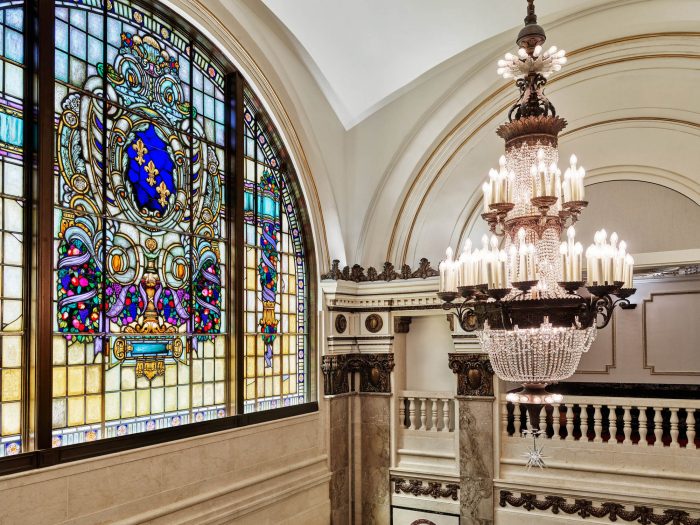 Referencing the golden era of talkies and films, the new Forum reinstates the screen under the proscenium arch. A discreet set of stairs and elevators also bring visitors to the balcony level, which hosts the best seats in the house to view the Forum. The generous leather theater-style seats with integrated electrical and data points are the perfect spot for visitors to relax while they wait for their Genius appointments. At the top of the balcony is the Genius Level. Located just beneath the theater’s projectionist windows, it offers a complete snapshot of the theater in all its restored glory.