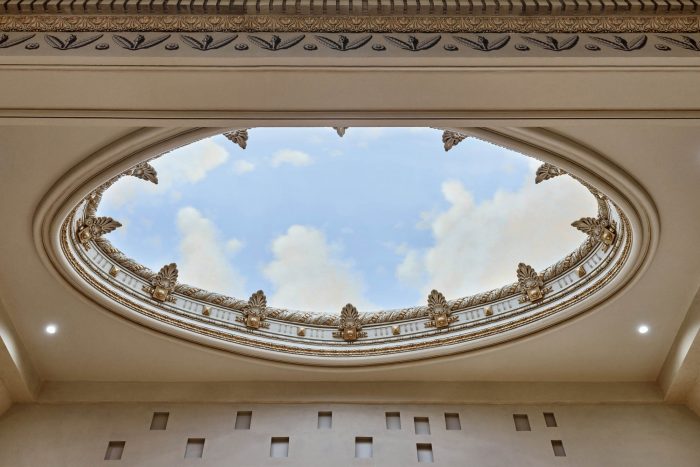 The design looks to create an active presence on Broadway. Visitors enter a generous lobby at street level. An immaculately restored grand staircase takes visitors to the upper levels, while the lobby opens up to the soaring volume of the main theatre hall at ground level, which has been completely transformed into a majestic display area. The intricate historic plaster detailing on the walls and ceiling, dating back to the 1920s, has been carefully restored and enhanced. The central dome of the theater’s ceiling has been reinterpreted with a fresco of the calming golden sunshine of the southern Californian sky, adding dynamism and color to space.