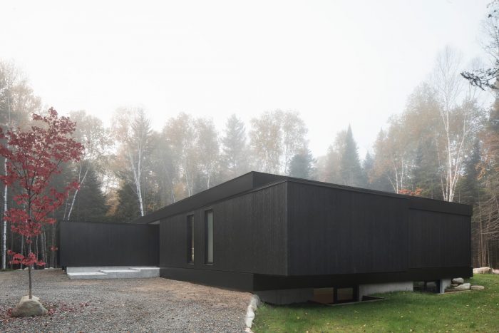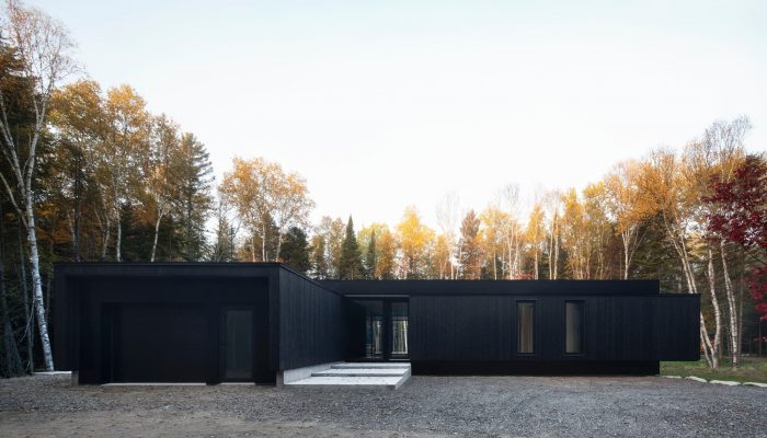The expansive, open floorplate of the fully-glazed central living space features a polished concrete floor, with floor-to-ceiling windows providing a powerful and seamless connection with the natural beauty of the exterior. To counter reverberation that abundant glazing sometimes invites, ACDF installed wooden planks on the ceiling, with half-inch gaps between them. On the underside of the planks, the firm inserted a black fabric that further contributes to capturing reverberation, while ensuring the acoustic harmony of the open space. The open floorplate comprises a kitchen, a dining area, and a generous living room, illuminated by suspended lamps from Lambert et Fils, a Montreal-based supplier whose innovative lighting fixtures have been integrated into several ACDF projects.