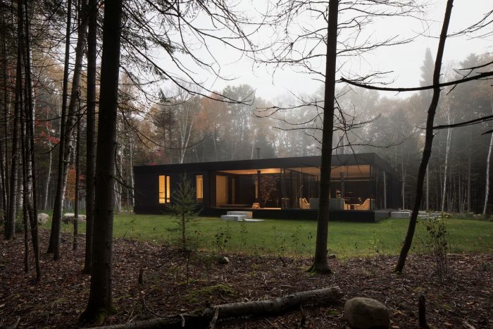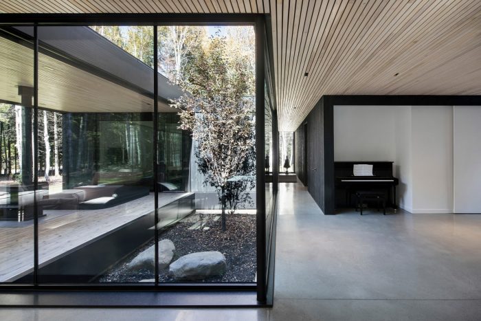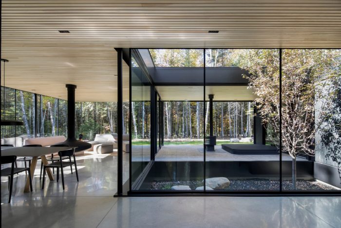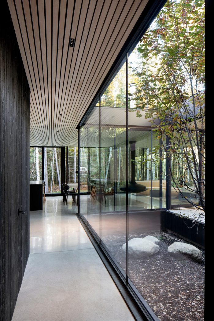 Upon approaching the main entrance, layers of glass provide insight into the internal lobby. Across openings in the central part of the home, a covered porch at the rear frames external views of the forest. On the internal side of that covered porch, in the center of the main structure, a small, wind-protected open courtyard showcases the family tree, which thrives in its natural setting. The covered porch, with its wood stove and comfortable seating, was designed as a gathering space with an indoor/outdoor ambiance that is in tune with both its internal and external surroundings. Open on two sides, the covered porch is equipped with screens on descending rollers to ensure the best of both worlds, providing protection against insects and the elements. With the screens descended, the enclosed porch provides a feeling of being integrated with the home’s interior spaces.