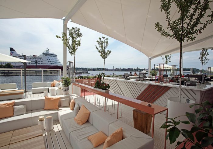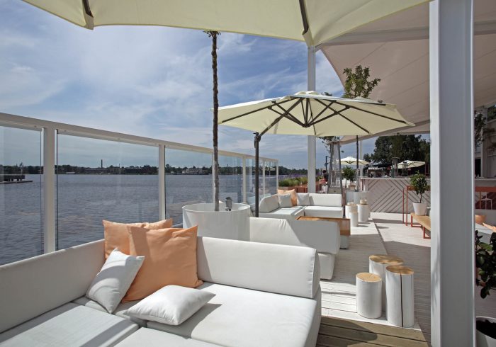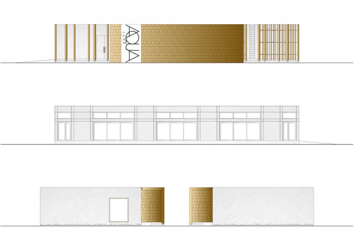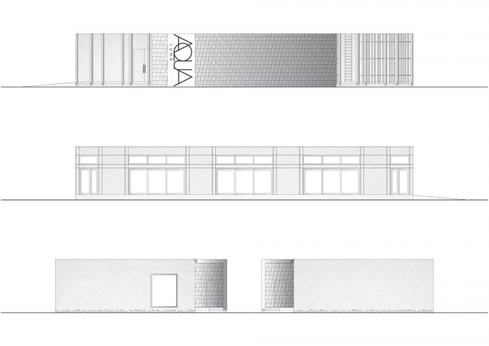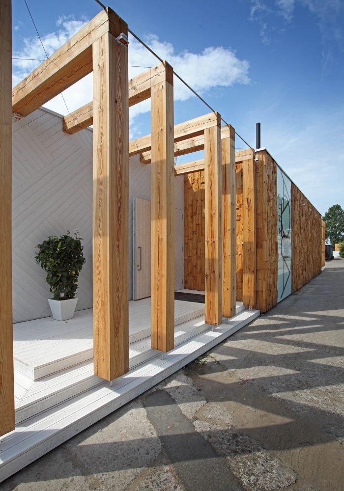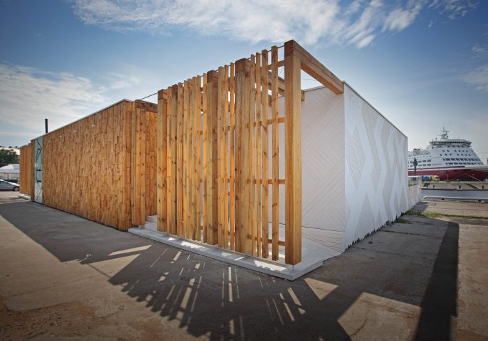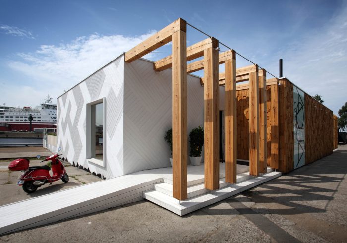 Restaurant AQUA LUNA is currently located in Andrejsala. The mobile building is a light timber structure and as such it can be easily relocated. The simple formed building is characterised by the façade finish – white diagonal planking and finely split, untreated wooden segments in the frontal façade.