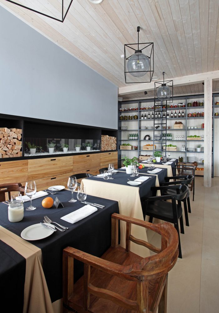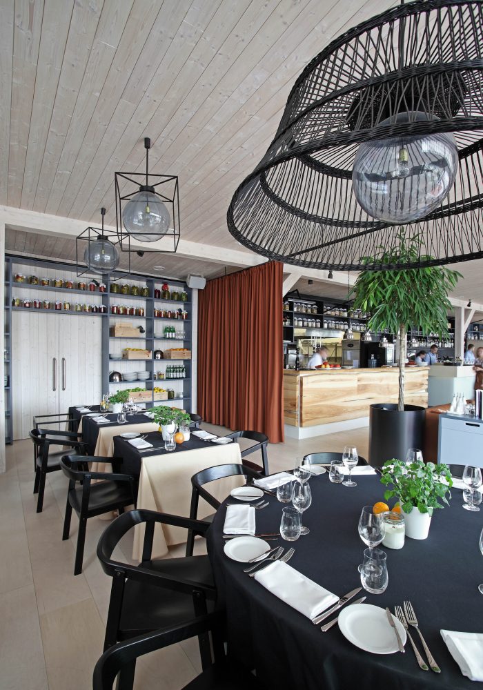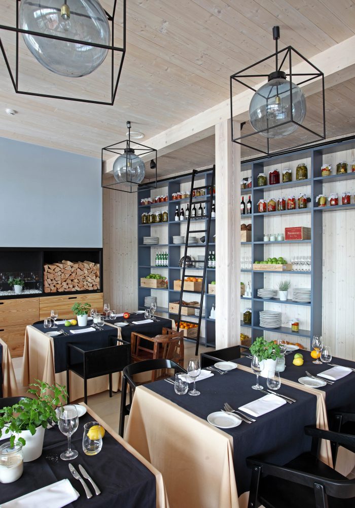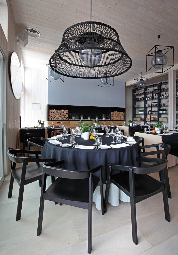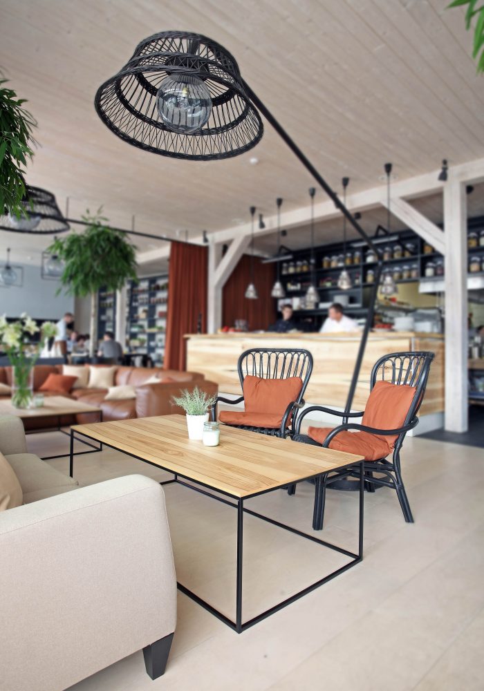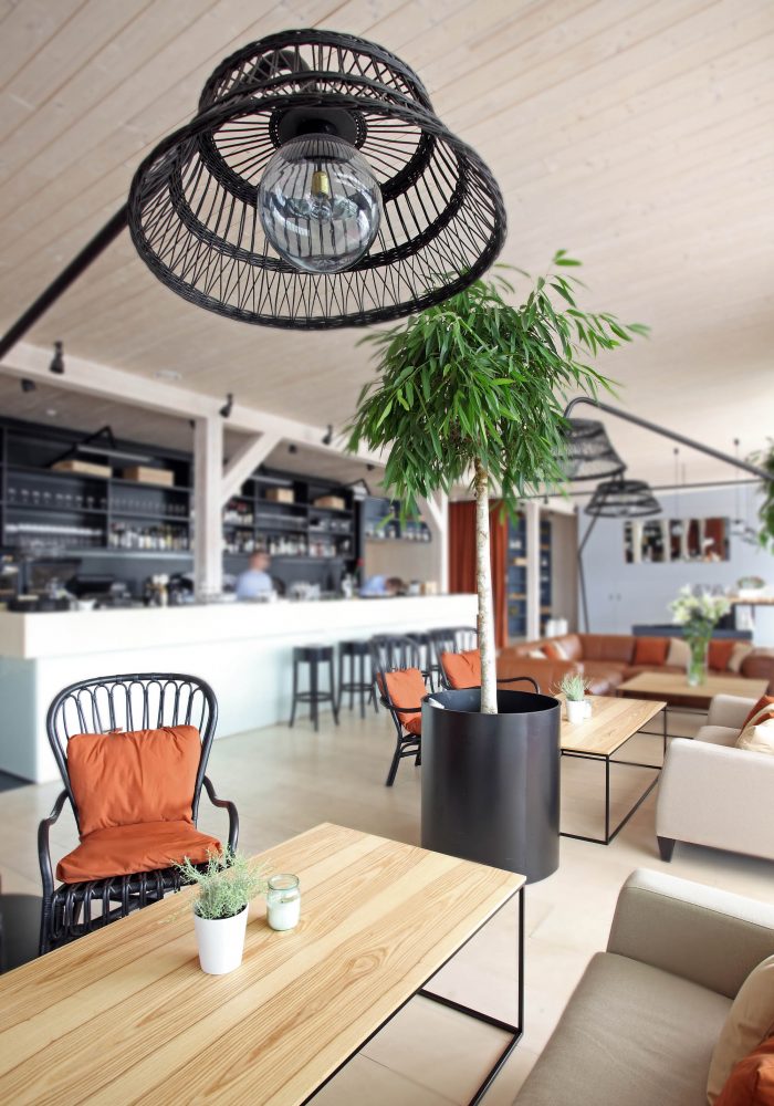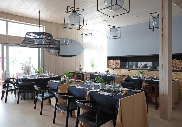 There are 3 main zones – bar, lounge and restaurant. The light and simple interior finishes serve as a background for large scale design elements – trees in metal pots, wickerwork lamps, tall solid wood tables and benches with metal legs, huge leather corner sofas, DJ furniture, long bar counter and shelves behind it. A large fireplace, dividing curtains and restaurant accessories in the shelves ensure warm and cosy atmosphere while details like the mirrors with brass frames, metal and glass lamps, cast iron radiators, shelf ladders, and a glass bar emanate style and elegance. Most of the furniture and design elements are made in Latvia.